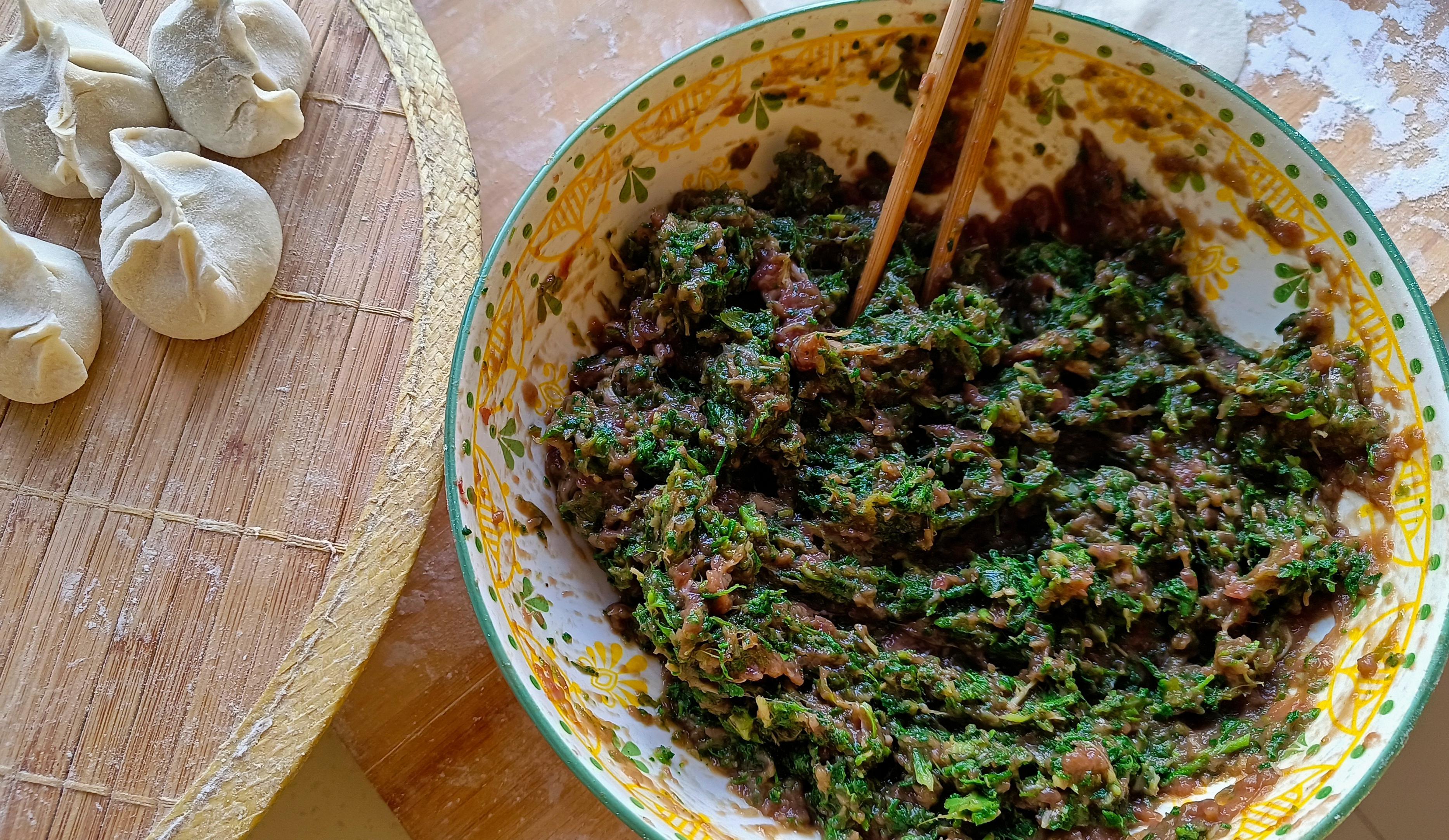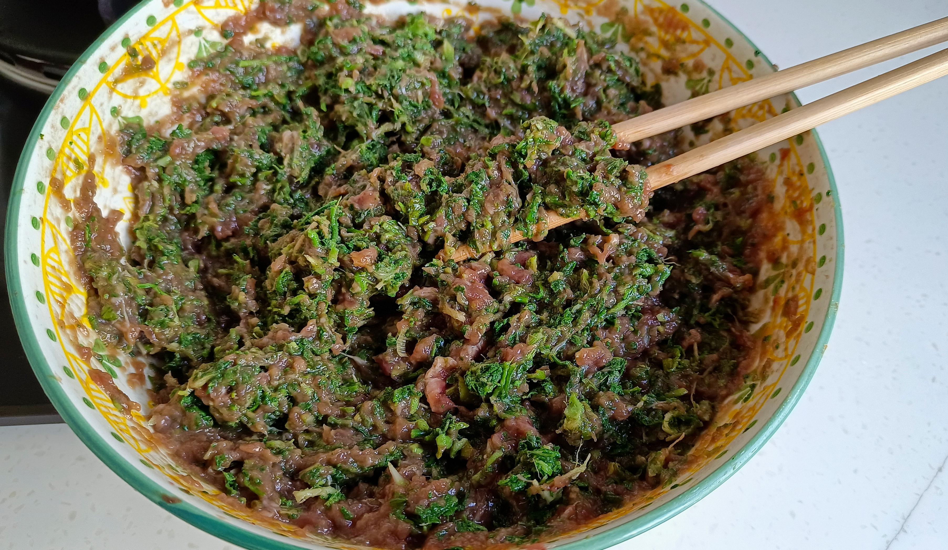 5.半個小時後,取出肉餡,將剁細的薺菜末倒入肉餡中,充分攪拌均勻後,就可以開始包餃子了。