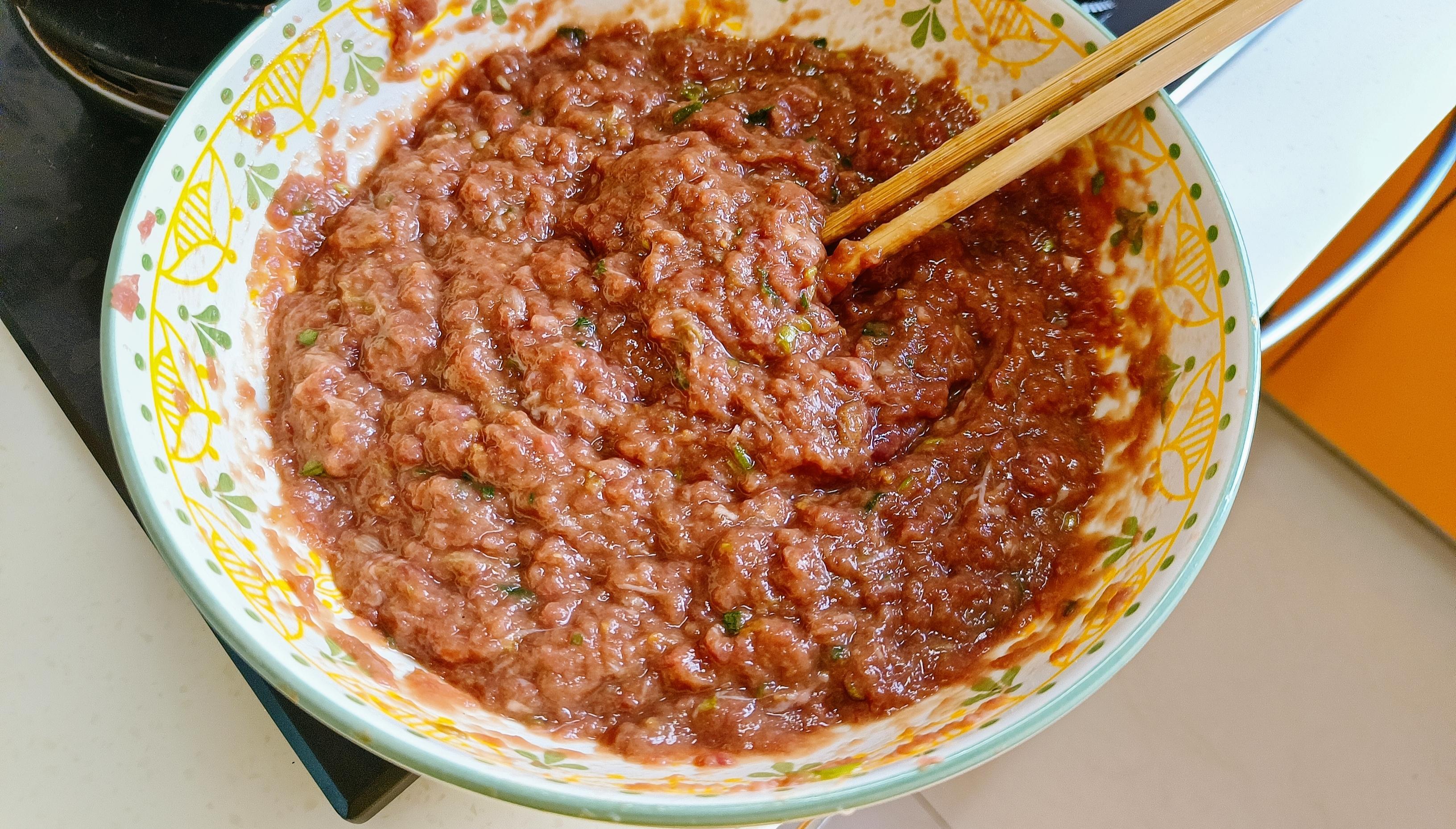 然後再打入一個雞蛋,加入適量食鹽,繼續攪拌均勻後,再倒入蔥姜油,繼續攪拌2~3分鐘左右,攪拌至肉餡用筷子夾起來後不掉即可,然後把肉餡放到冰箱中冷藏保存半個小時左右,這樣肉餡就會凝固,包的時候不出水,喫的時候卻爆汁。