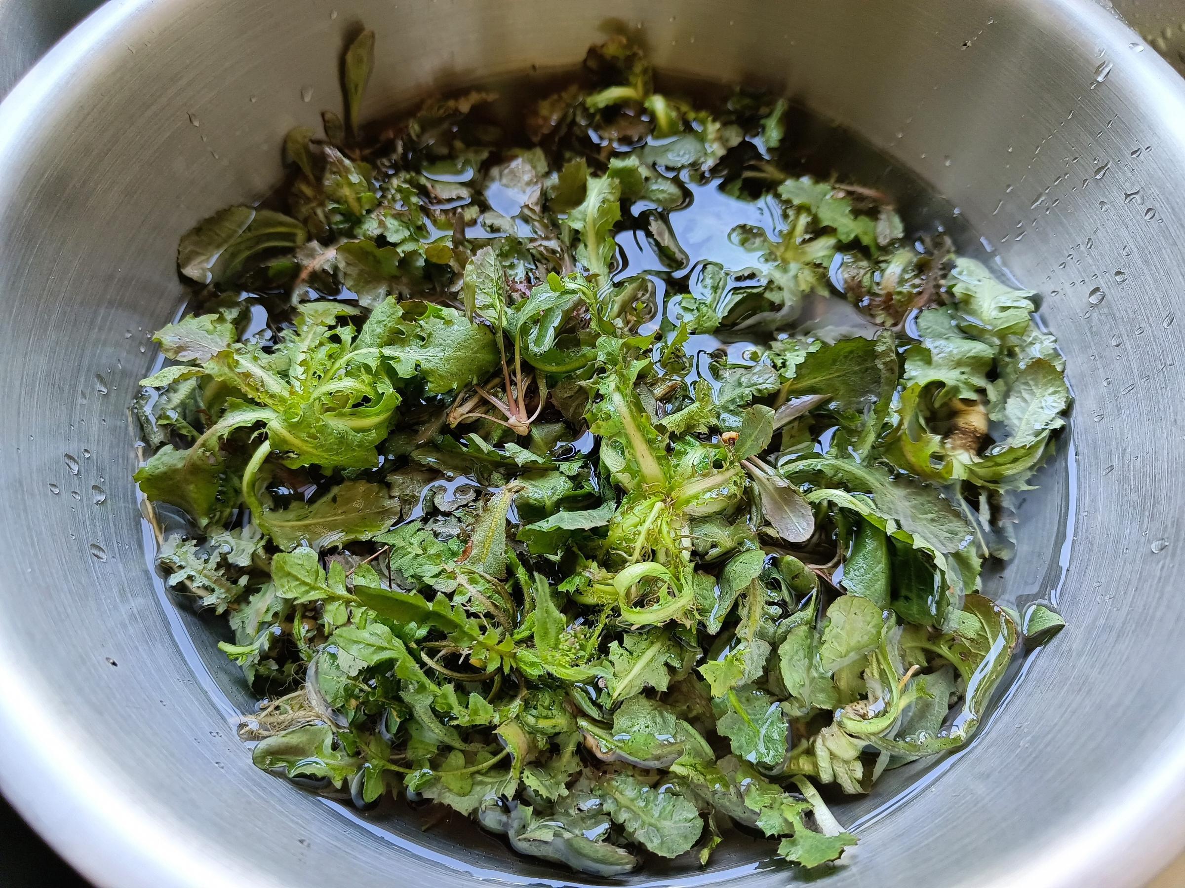 1.先把苦菜裏的雜草挑揀乾淨,摘去老葉枯葉後放到水中浸泡5~10分鐘,苦菜經過浸泡後葉片就會舒展開,根上的泥土也會泡下來,再洗的時候就會清洗的更乾淨了。清洗苦菜的時候不要用力揉搓,會把葉子搓爛掉,輕輕撈洗三五遍後,看到水完全變清就可以了。