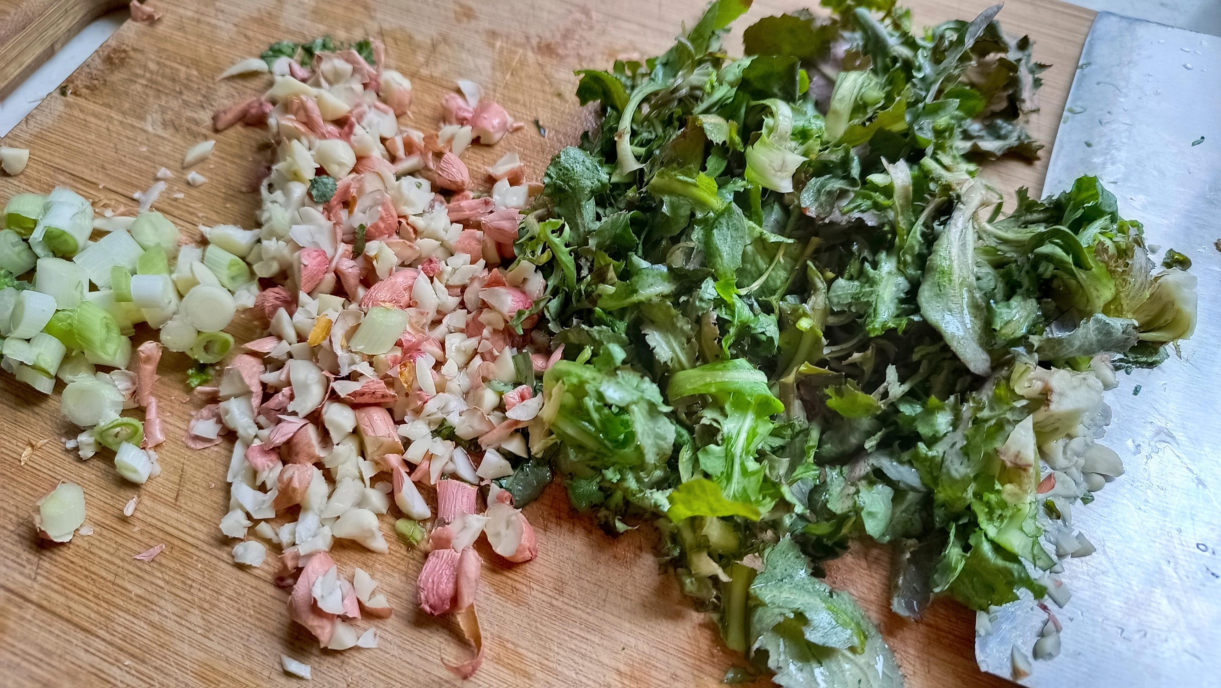 2.洗淨的苦菜控乾淨水分,然後切上幾成刀,特別是較粗的根部要切成小塊,然後放一邊備用;