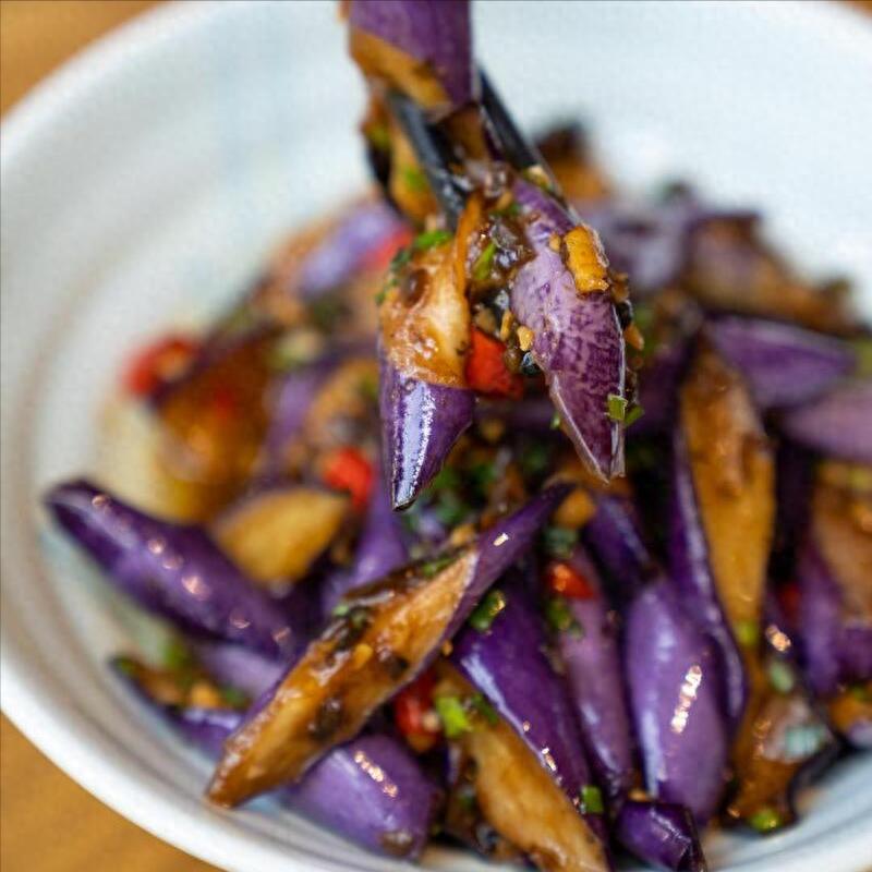食材:茄子、香菜、大蒜、鹽、味精、生抽、老抽、蠔油、澱粉、食用油