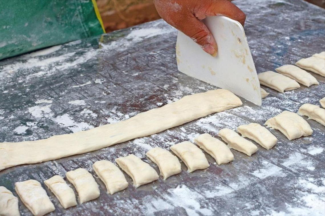 4、面板上提前撒上一層乾麪粉,然後將麪糰放上去,但是不要揉,很多人這裏犯錯誤了,仔細看好,不需要揉搓,直接用擀麪杖擀成長條狀。擀好後的長條,切成一條一條的劑子,每兩條疊在一起。