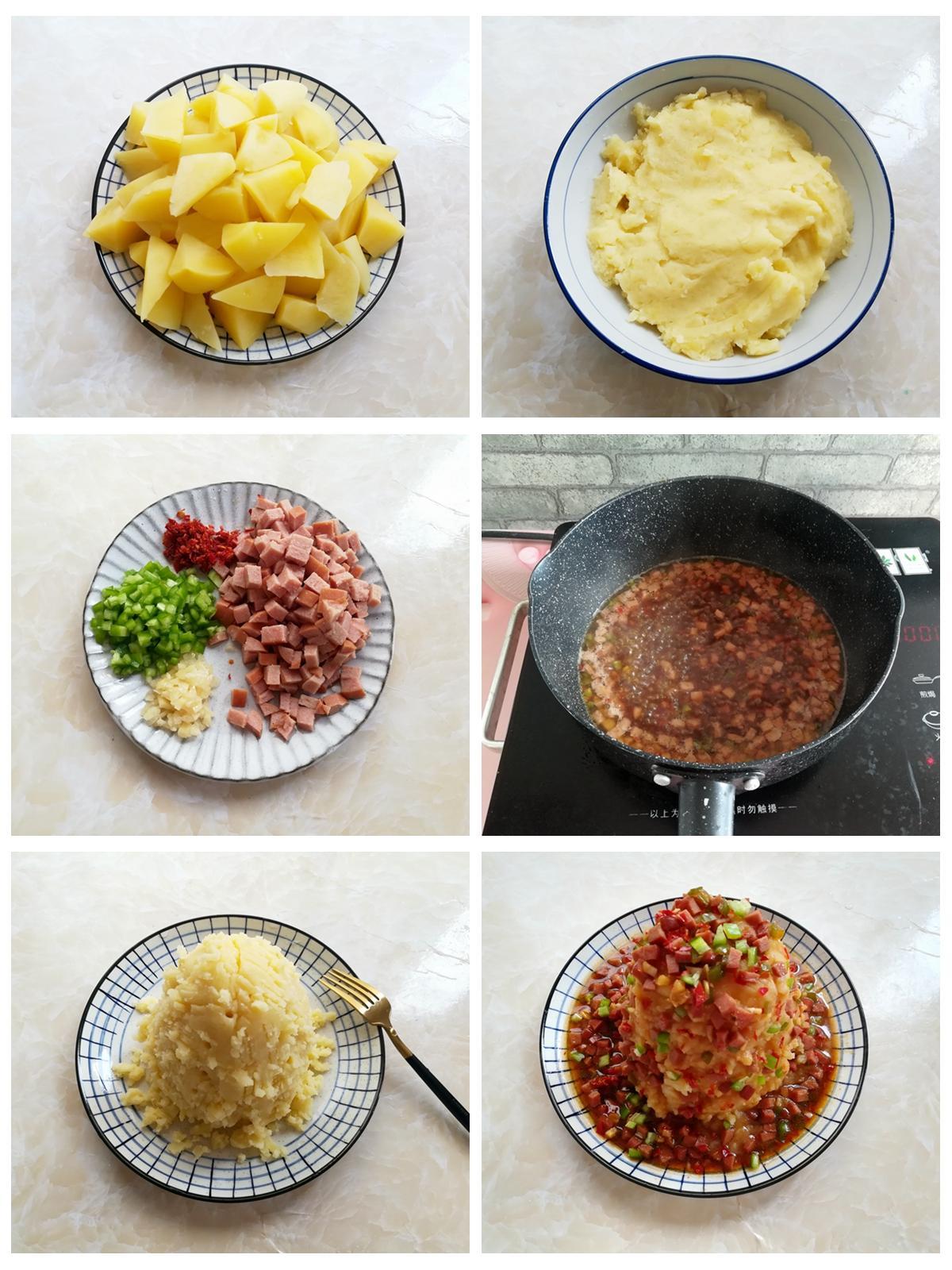 做法:1,土豆清洗乾淨,去皮切成滾刀塊,放入燒開水的蒸鍋裏,大火隔水蒸10分鐘,蒸好的土豆放入碗裏,用勺子壓成土豆泥。