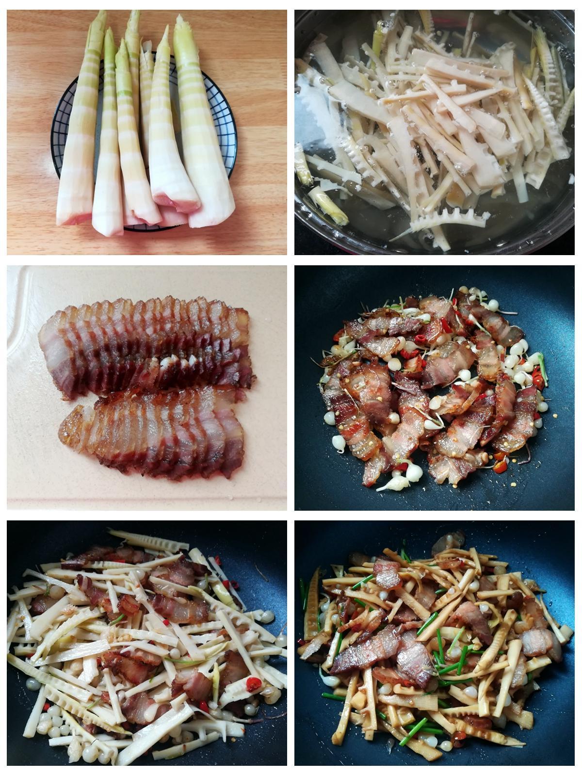 推薦美食【春筍炒臘肉】食材:春筍、臘肉、野蔥、辣椒、食用油、老抽、鹽