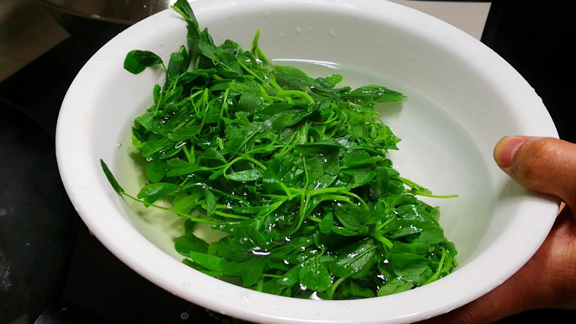 2.接着我們再來摘洗苜蓿菜,先把苜蓿菜的嫩芽摘下來,去掉咬不動的老梗,然後用流動的清水多衝洗幾遍,提前燒一鍋開水,水開後加入少許食用鹽,然後下入苜蓿菜,焯燙約1分鐘後,控水撈出快速放到冷水中過涼。