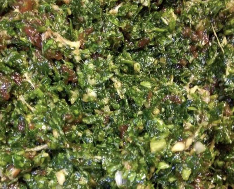 3.過涼後的苜蓿菜控水撈出,擠乾淨水分後放到菜板上剁細,剁好後再把它放到肉餡中,然後加入適量的鹽和香油調味,然後將肉餡和苜蓿菜充分攪勻就可以了。