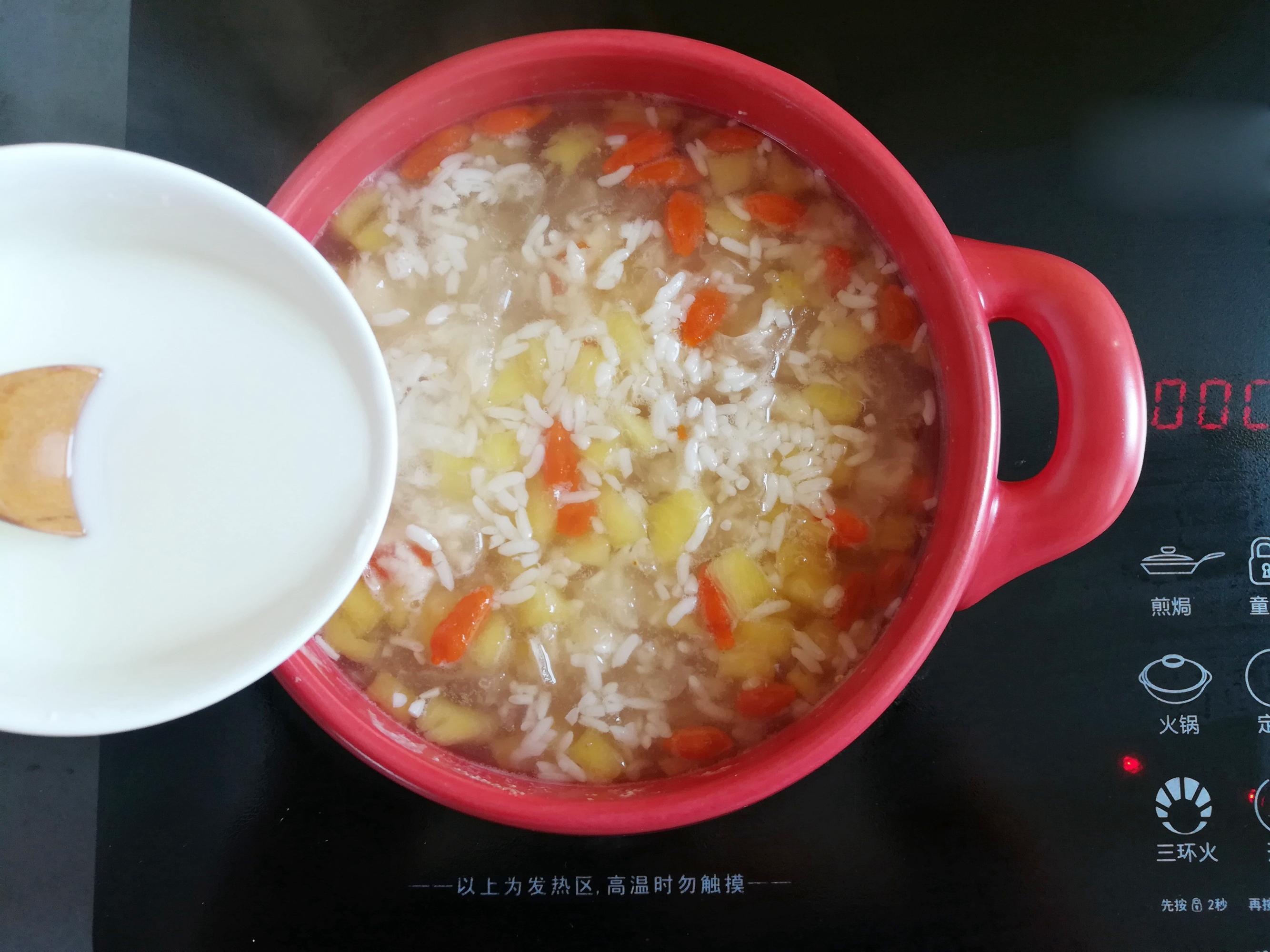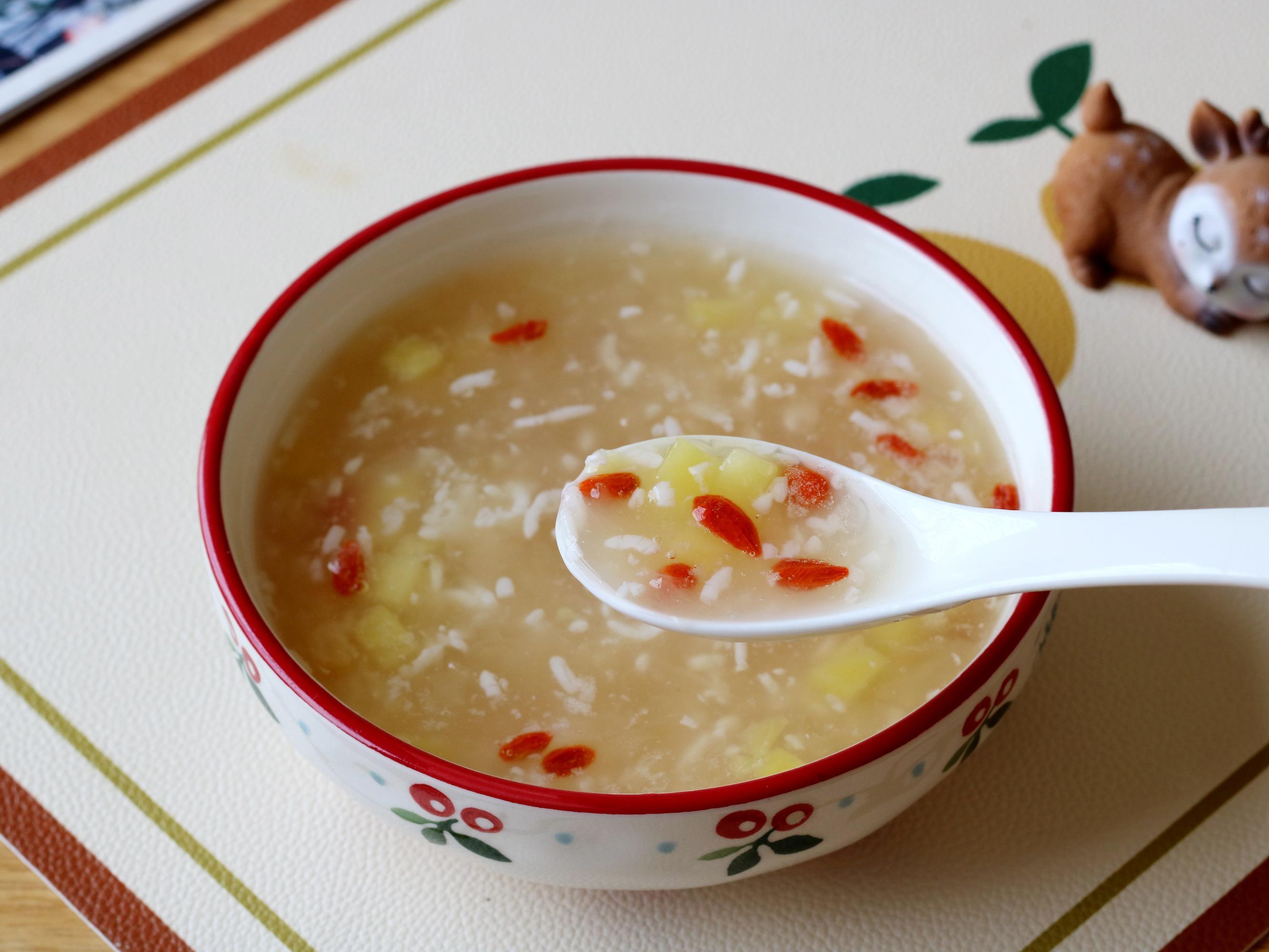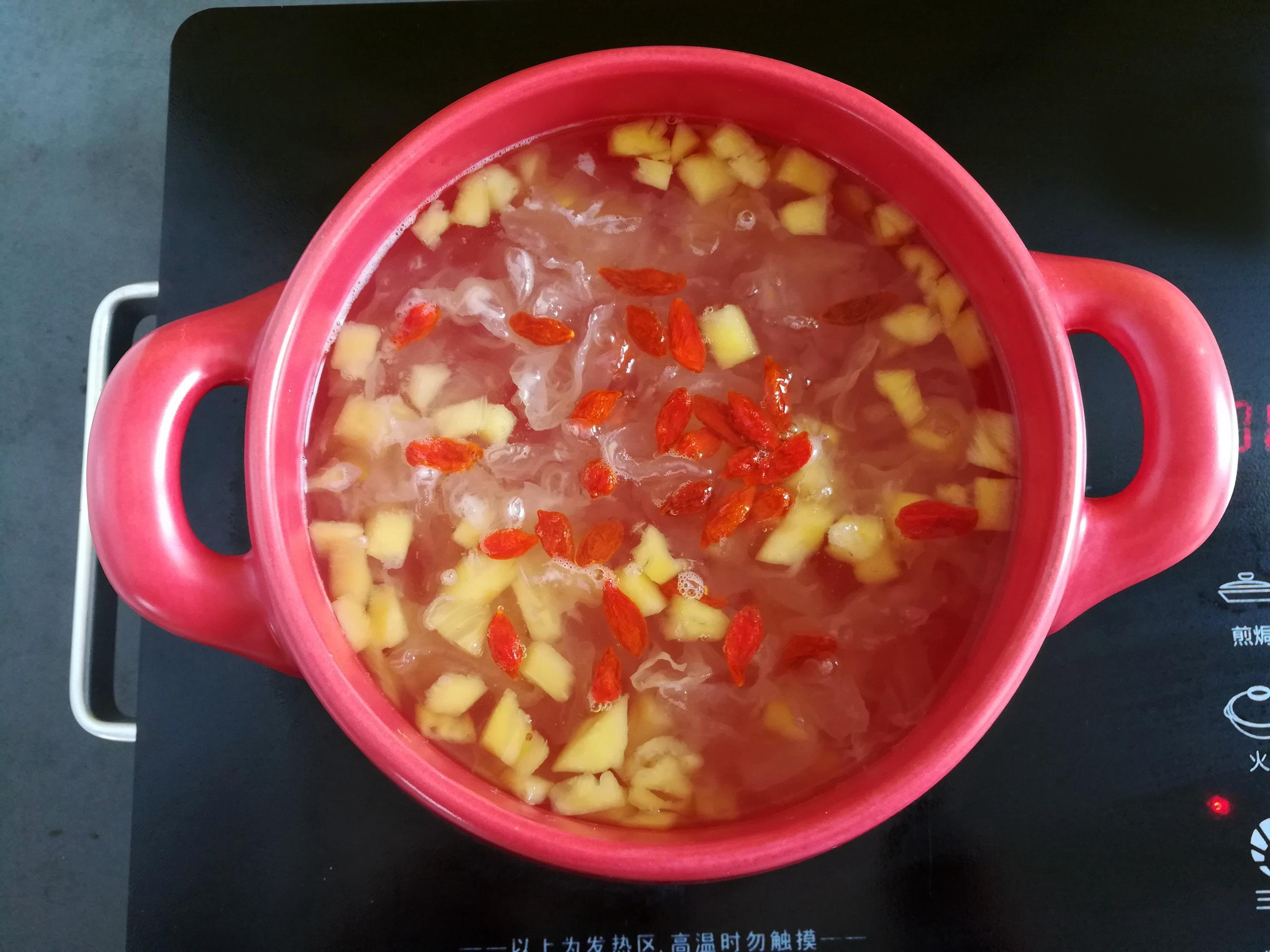 砂鍋放入適量的水,放入銀耳大火煮開,中火再煮20分鐘,加入菠蘿和枸杞煮5分鐘。