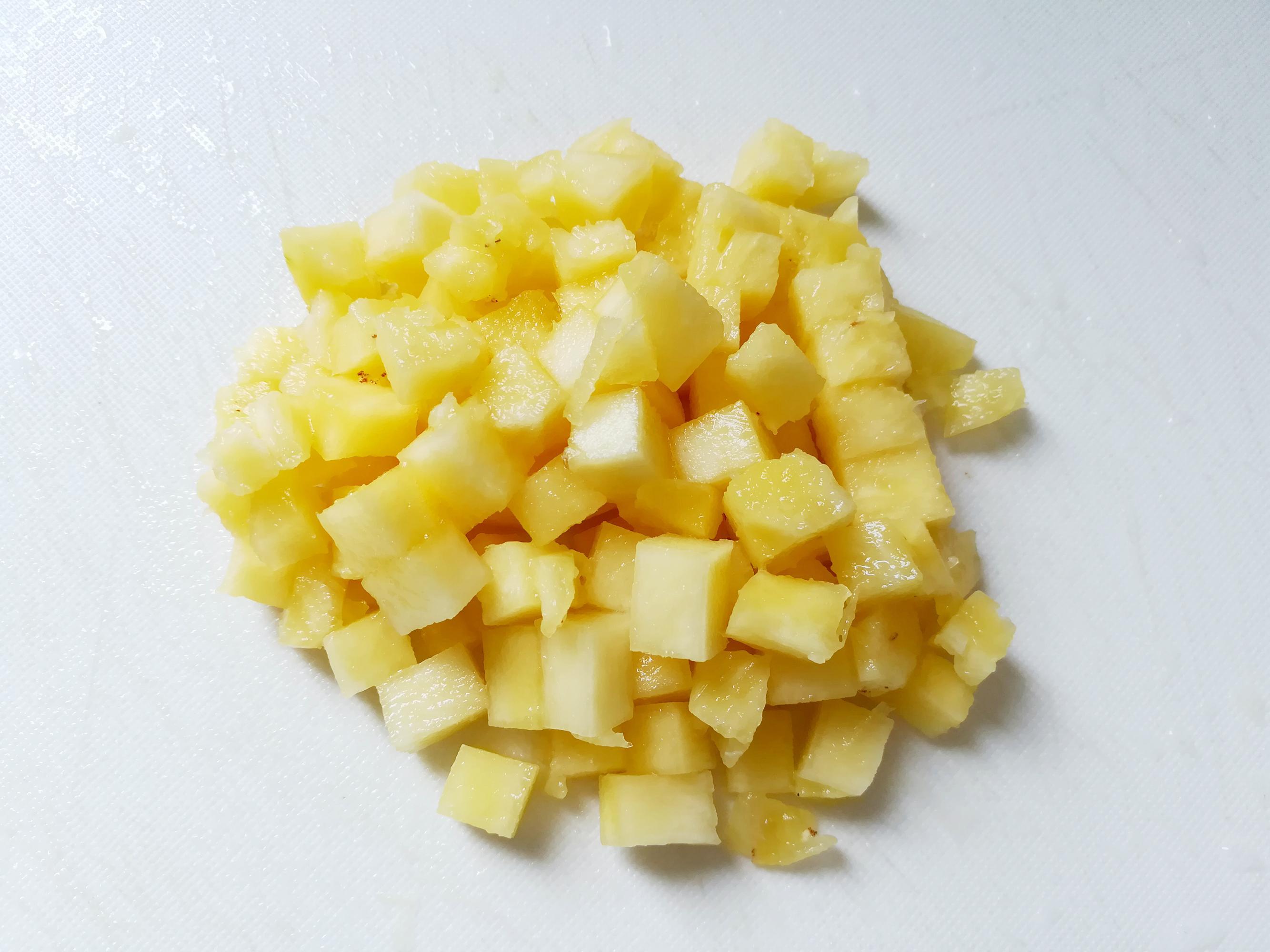 菠蘿切成玉米粒大小的顆粒,我在路邊買的菠蘿都是可以幫削皮的,方便又省事。