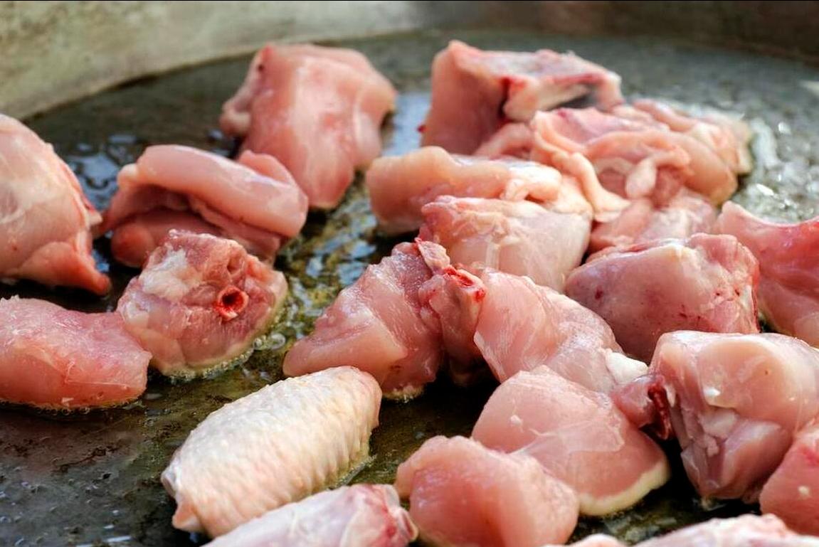 4、待其燒熱以後,把雞肉倒進去,開始不停翻炒,翻炒一會兒雞肉表面就上色了,這時候往裏面添水。提前把雞肉翻炒一下,燉出來的雞湯纔會更香,特別鮮美,炒雞肉這是“多做2步”。