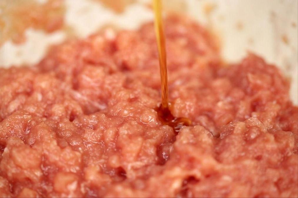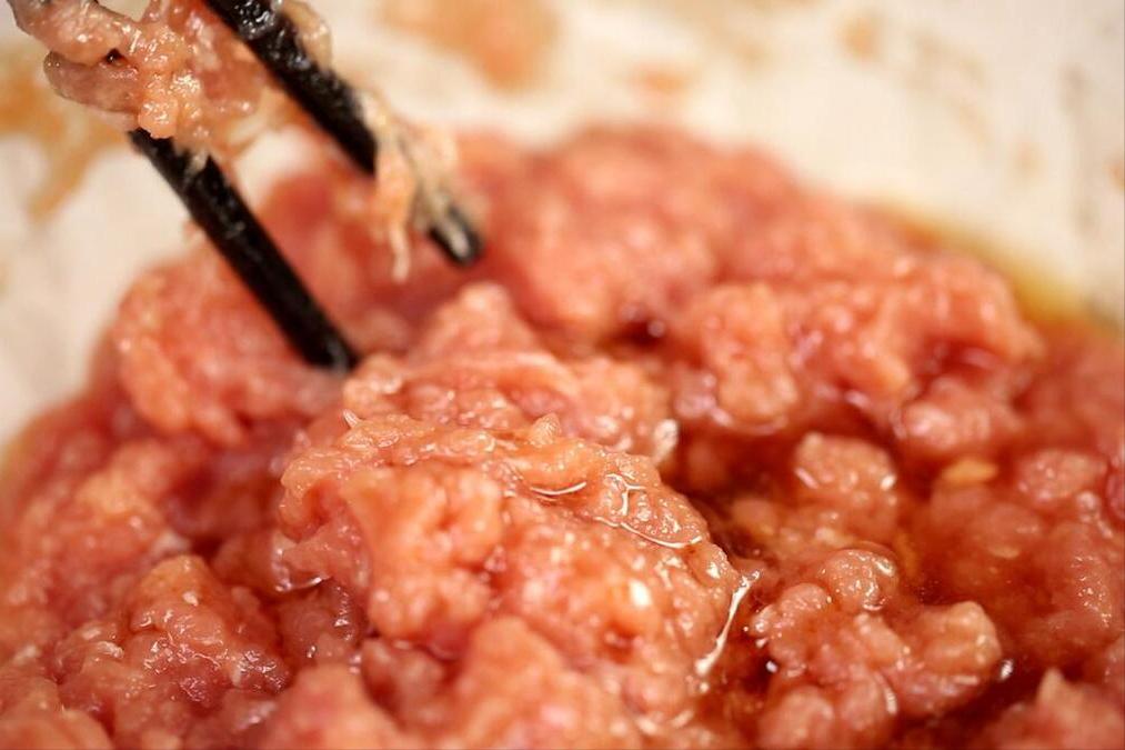 2、接下來倒出來倒在盆裏,然後往裏面倒上花椒水,花椒提前用開水燙一下,等晾涼了之後再用。準備小半碗就行,倒進去以後充分攪拌,攪拌至上勁爲止。加入花椒水,這是“多放的第1樣”,使得餡料更多汁,還有去腥作用。