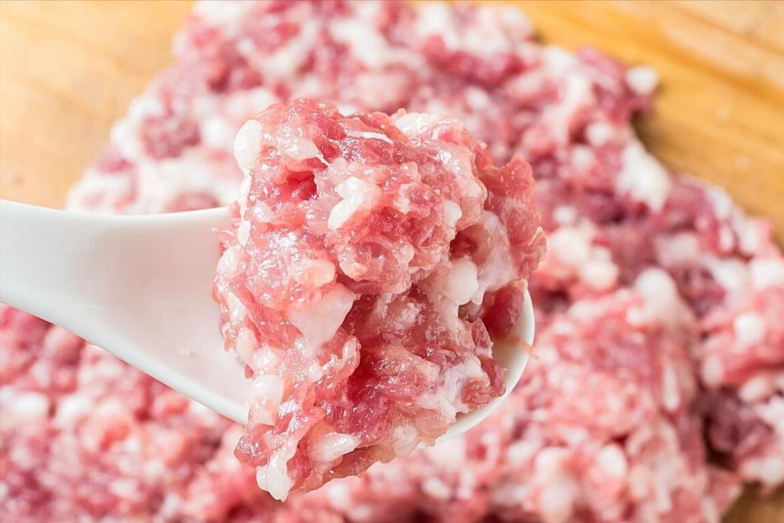 1、新鮮的一塊豬肉,買來以後清洗乾淨,最好用肥瘦相間的,這樣弄出來纔會更好喫,再把上面的筋膜剔除,然後切成大塊,放在絞肉機中絞碎。