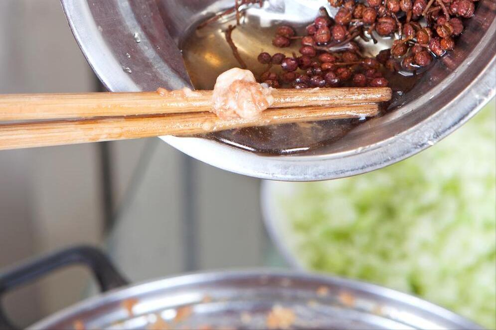 4、把餡料攪拌均勻,讓其充分融入到肉餡裏之後,就可以停手了,接下來還有1味料需要放。把鍋子準備好,往裏面倒油,倒上食用油以後,接着再準備點花椒、八角、香葉、蔥姜等,開始炸。