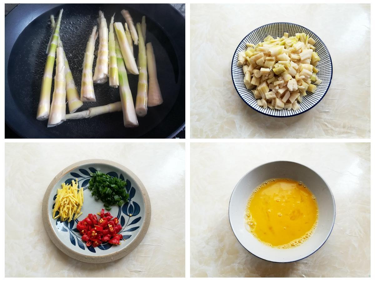 食材:野竹筍、雞蛋、生薑、辣椒、香蔥葉子、鹽、食用油
