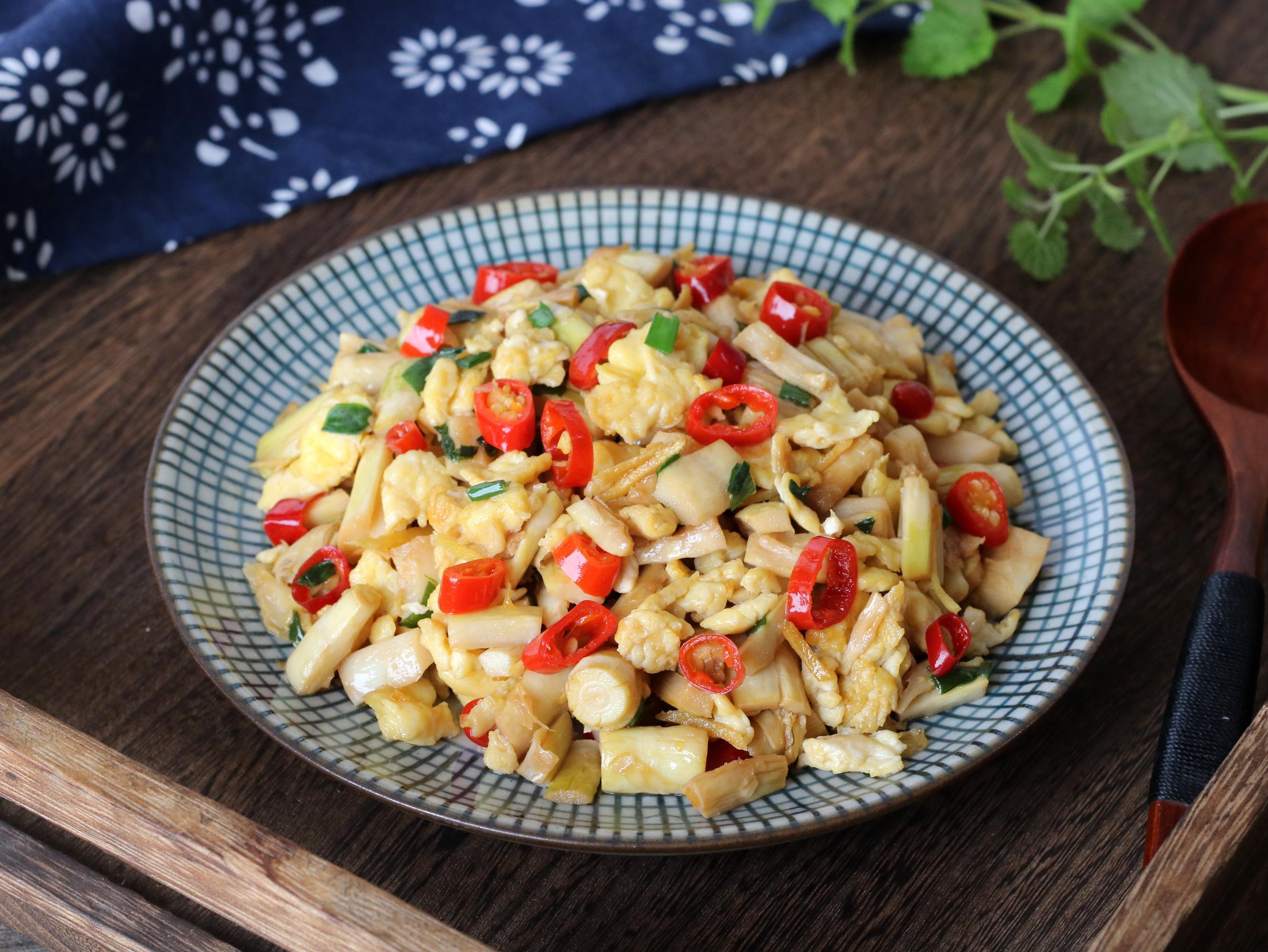推薦美食【野竹筍炒雞蛋】,野竹筍爽脆美味,搭配雞蛋和辣椒一起炒,營養好喫又下飯,比喫肉還香呢。
