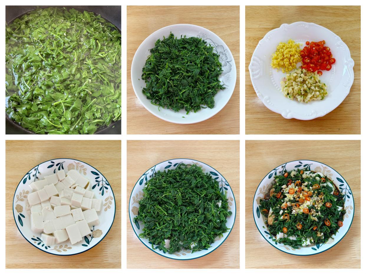 食材:薺菜、嫩豆腐、生薑、大蒜、辣椒、生抽、食用油