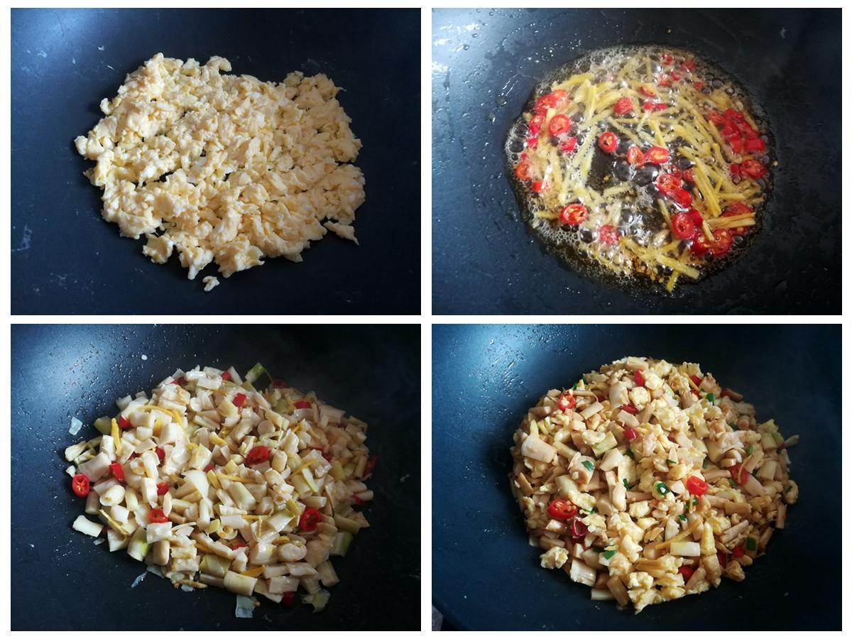 5,鍋裏重新放入,放入薑絲和辣椒熗鍋,翻炒出香味。加入野竹筍翻炒均勻,加適量的鹽調味,加入炒好的雞蛋翻炒均勻。