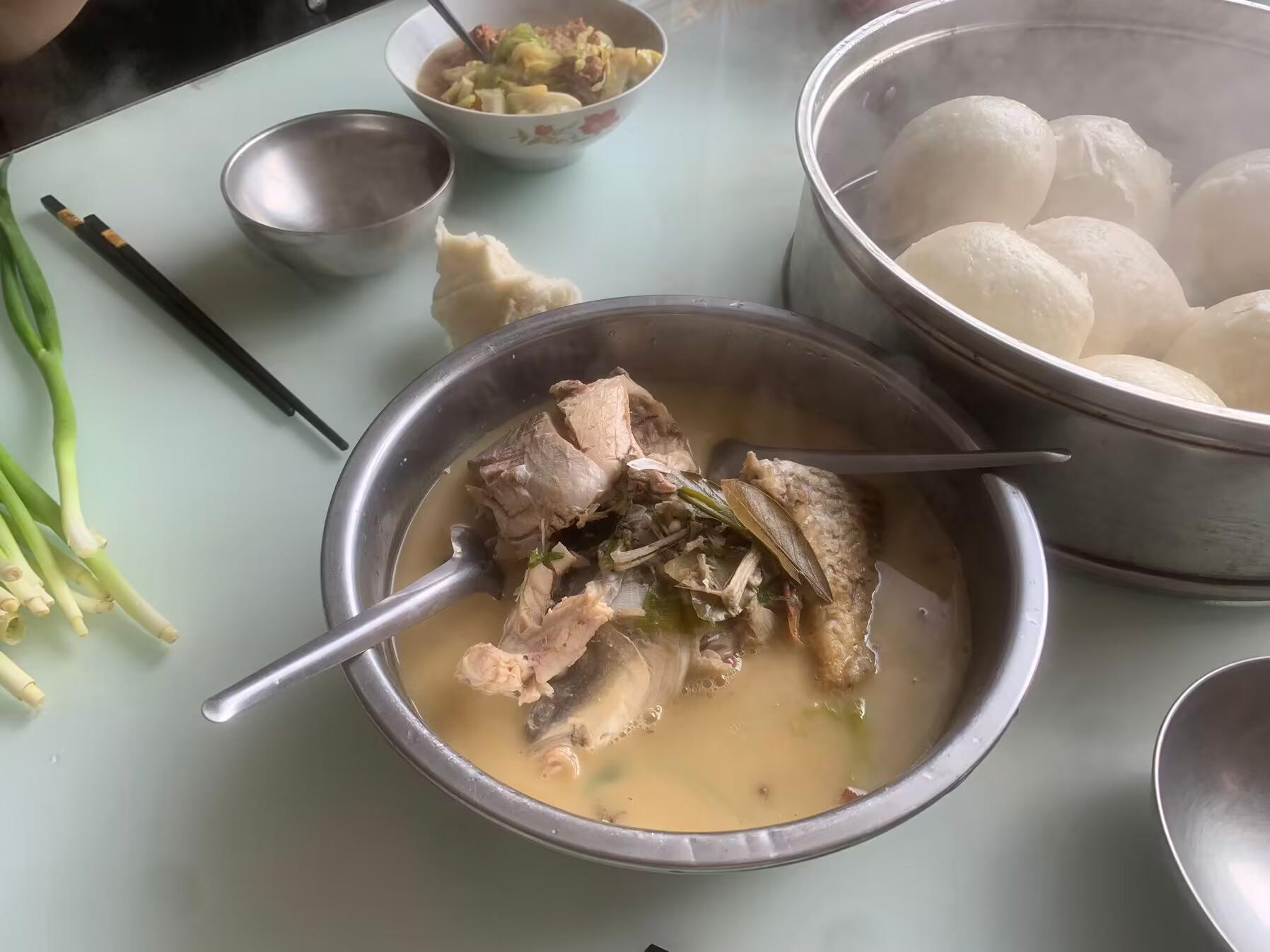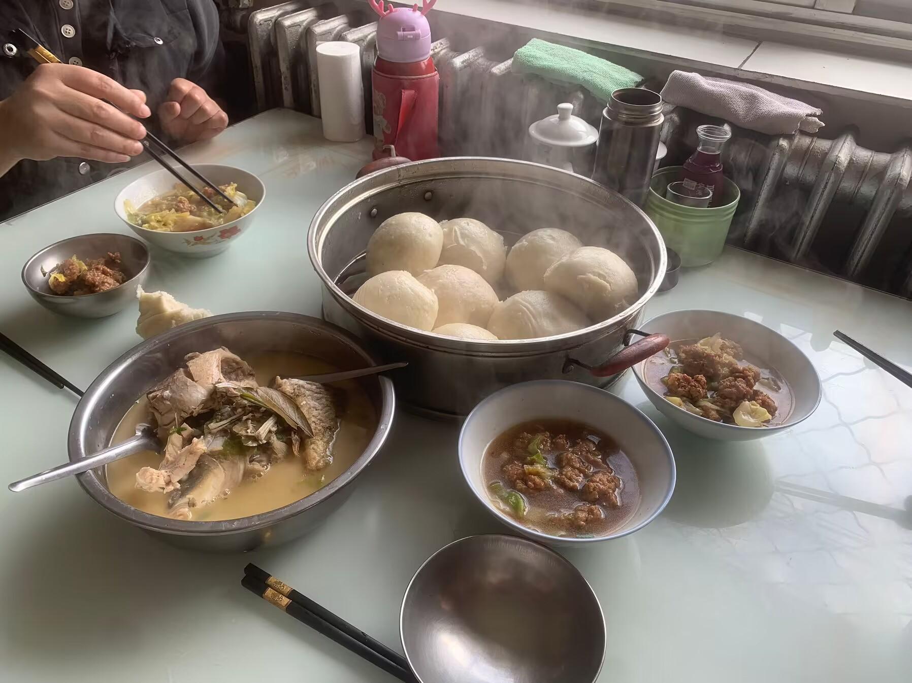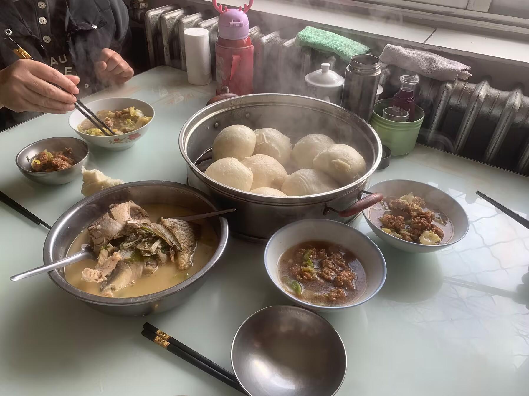 饅頭還是俺娘自己蒸的,我家一年到頭都不買饅頭,都是自己蒸,用自己磨得小麥粉蒸出來得饅頭筋道好喫,一次多蒸一些,喫的時候熱一下就可以,而且放久了也不會變味。大饅頭配着豬肉丸子湯,一個人一大碗,再加上一小盆鯽魚湯。