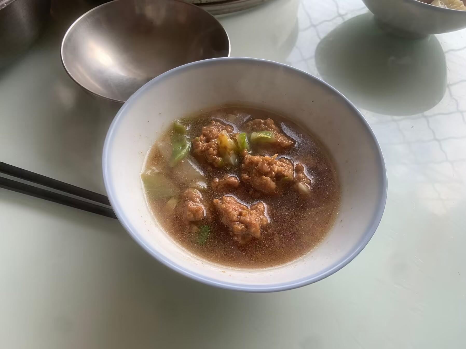 嫂子早上去隔壁村趕集買了3斤豬肉餡回來,中午給我溜丸子湯喫,比炒菜省事,我和孩子們也都喜歡喫。嫂子做了一大鍋的丸子湯,裏面還放了一些圓白菜,有菜有肉滿滿一大盆。