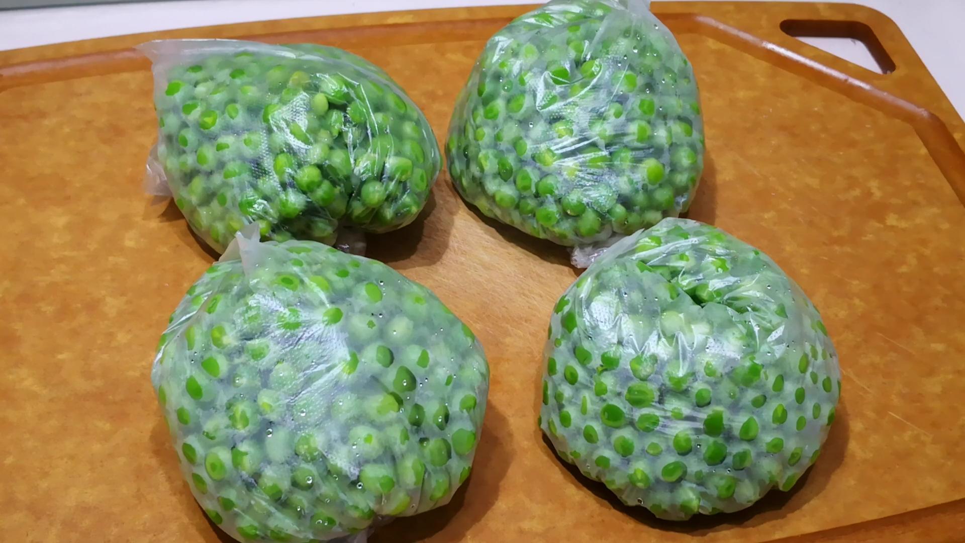 這樣包裝好的豌豆放到冰箱保鮮室中,喫個三五天不會壞。如果想要更長期的保存,就需要把它放到冰箱的冷凍室保存,可以放一年,拿出來喫還和新鮮的一樣,不變色不變味。