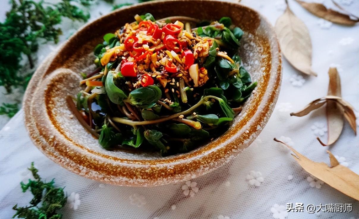 將拌好的馬齒莧盛入盤中,即可上桌享用。此時的馬齒莧,色澤鮮亮,口感爽滑,味道酸辣適中,令人胃口大開。