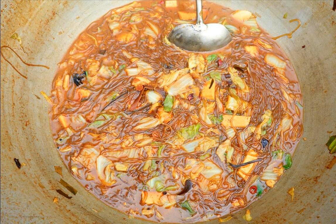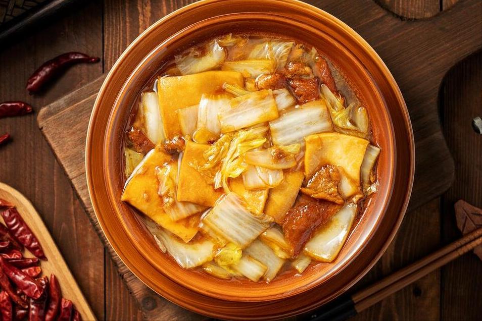 食材:白菜、粉條、肉末、幹辣椒、蔥花、鹽、味精、白糖、生抽、老抽、料酒