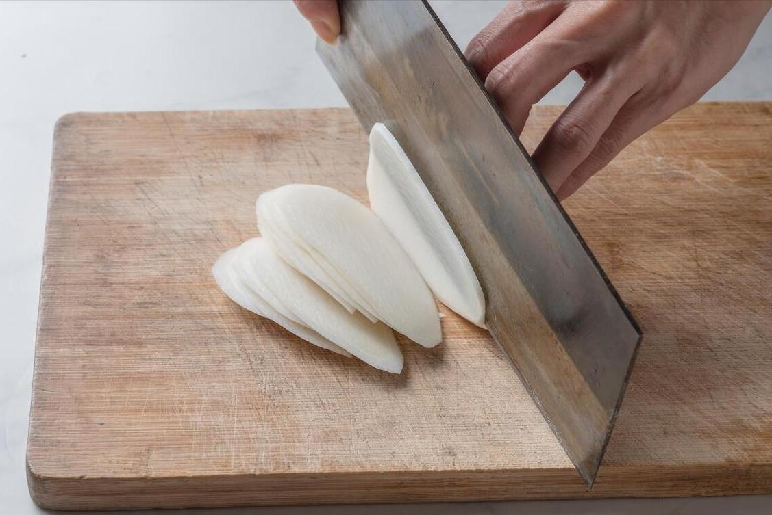 2、一切兩半,再一切涼拌,然後切成片狀,切片的時候最好切成夾刀片,也就是每3片之間不切斷,厚度約2mm,這樣醃製出來會更加爽脆的。切好後的蘿蔔片,將其盛在碗裏,然後準備殺水。
