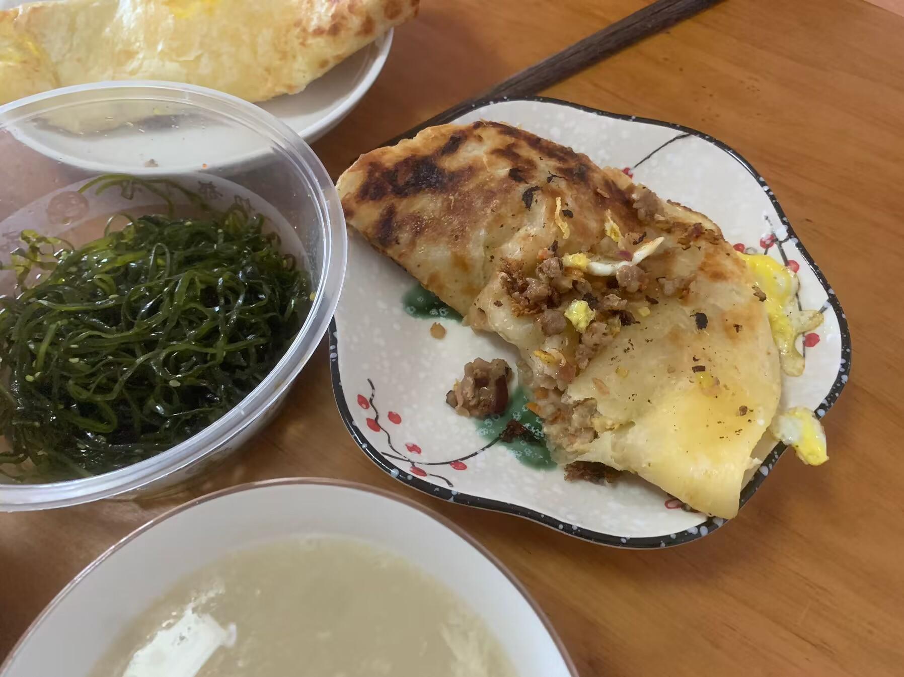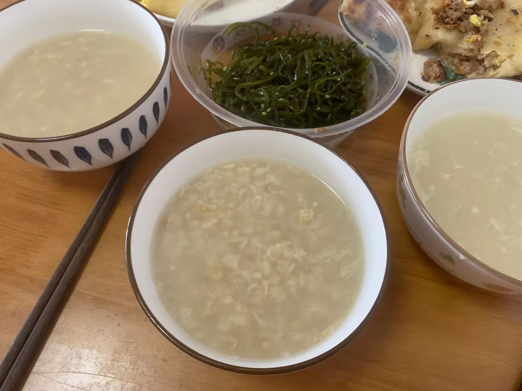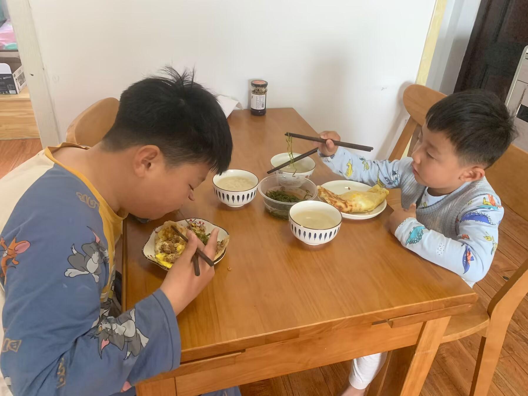 早上一般我都不炒菜,就是買一些鹹菜來配粥喝。給孩子們一人煎了一個餅,一碗粥。小兒子飯量小,一個餅喫不上,剩下我就喫。孩子們喫的是津津有味,一直說媽媽做的早飯比外面買的好喫多了。看這喫相,大兒子一個雞蛋肉餅都不夠,小兒子超喜歡喫海帶絲,一直喫個不停。