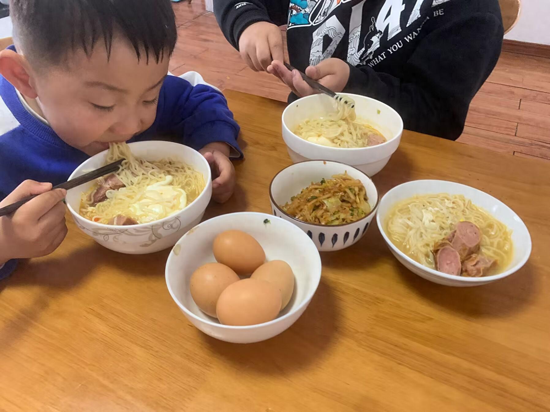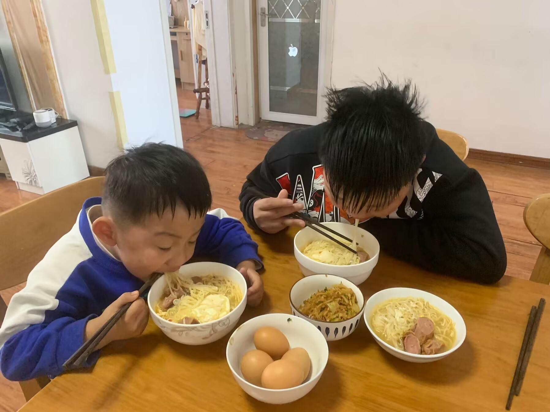 看着兩個孩子狼吞虎嚥的喫着,心裏特開心,我家孩子一點都不挑食,他們哥倆喫着麪條,我給剝着雞蛋。老大的飯量很大,連我那一碗都喫光了,我喫了剩下的炒餅和一個雞蛋。孩子們喫飽後,很自覺的去洗手,穿戴好衣服,背起書包就去上學。