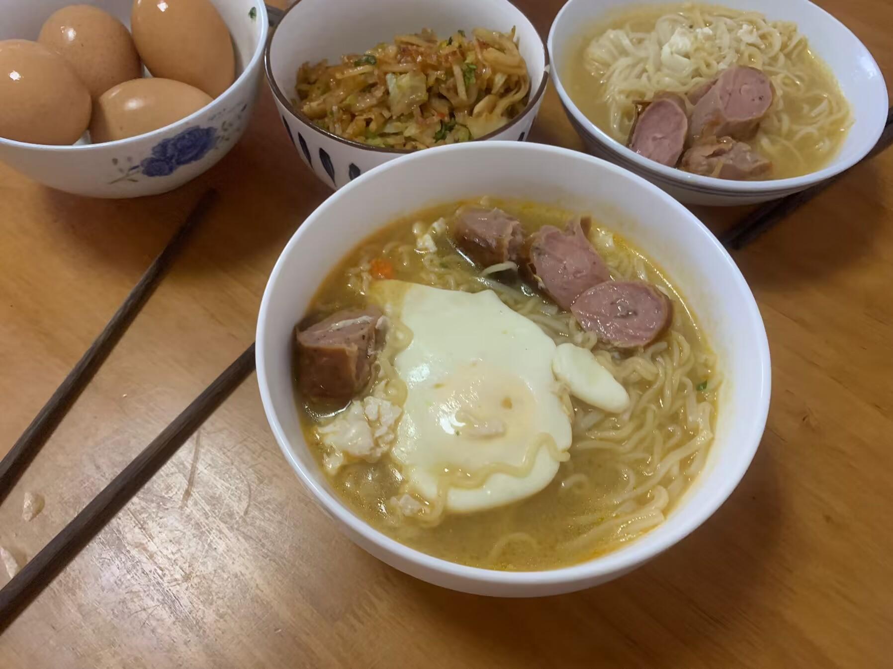 平時都不給孩子喫方便麪,可是孩子們喜歡喫,偶爾喫一次,讓他們開心一下。這次煮麪條時放了一袋方便麪,孩子們可開心,都說媽媽好。煮麪的時候打了2個雞蛋,還放了2根切好的火腿腸,噴香的麪條煮了5分鐘,煮的爛一些好消化,孩子們一人一碗再加一個煮蛋。