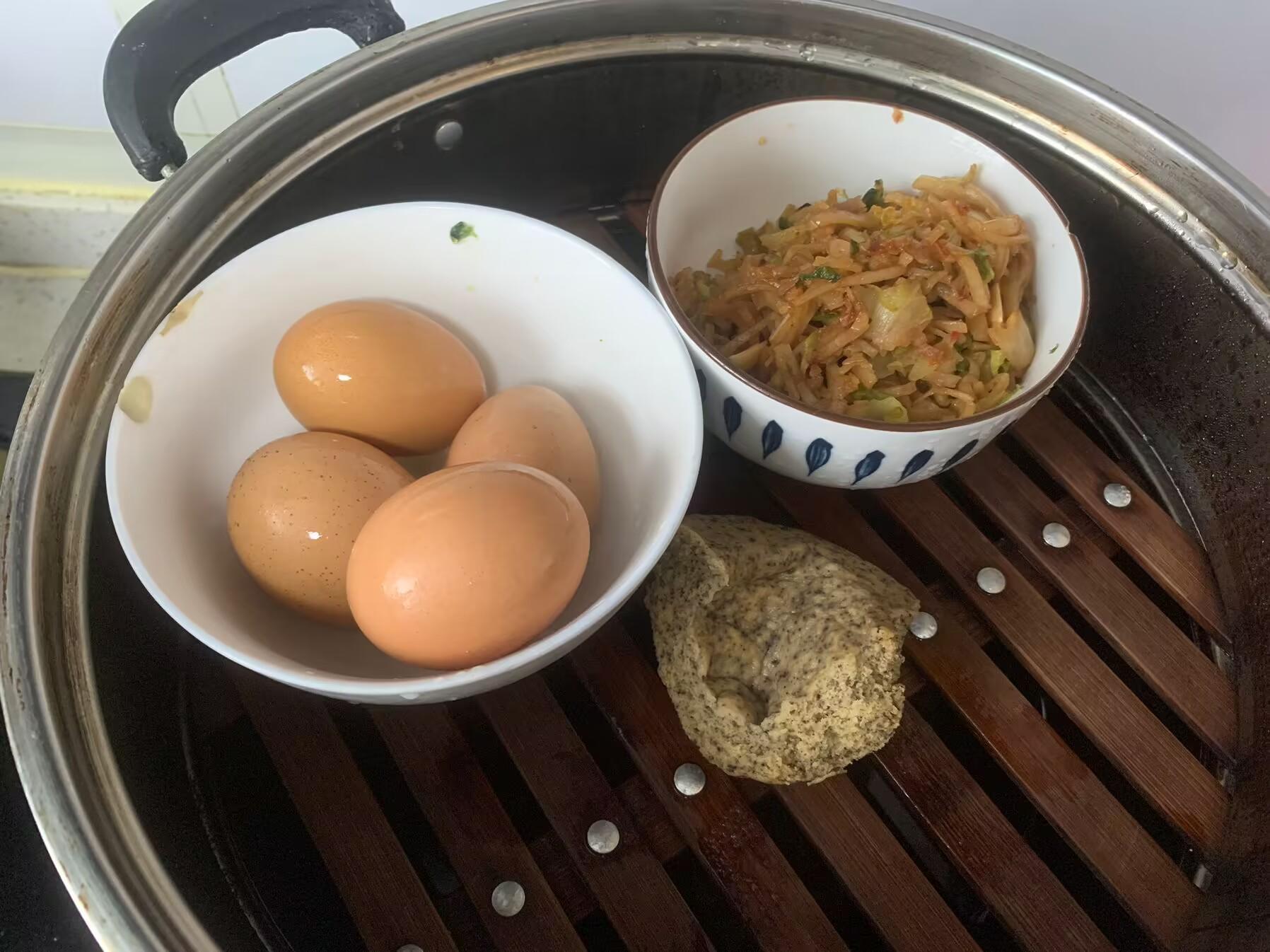 由於晚上在老家幹活回來後特別累,就在路上順便買了3塊錢的餅絲,正好婆婆媽還給帶了一個大頭菜,用大頭菜炒了炒餅絲,我們三個沒有喫完,還剩下一小碗,早上煮雞蛋的時候順便熱了一下。每天早上我家必喫的就是白水煮蛋,雞蛋的營養極高,每天喫一個可以補充體內的蛋白質以及增強體質。