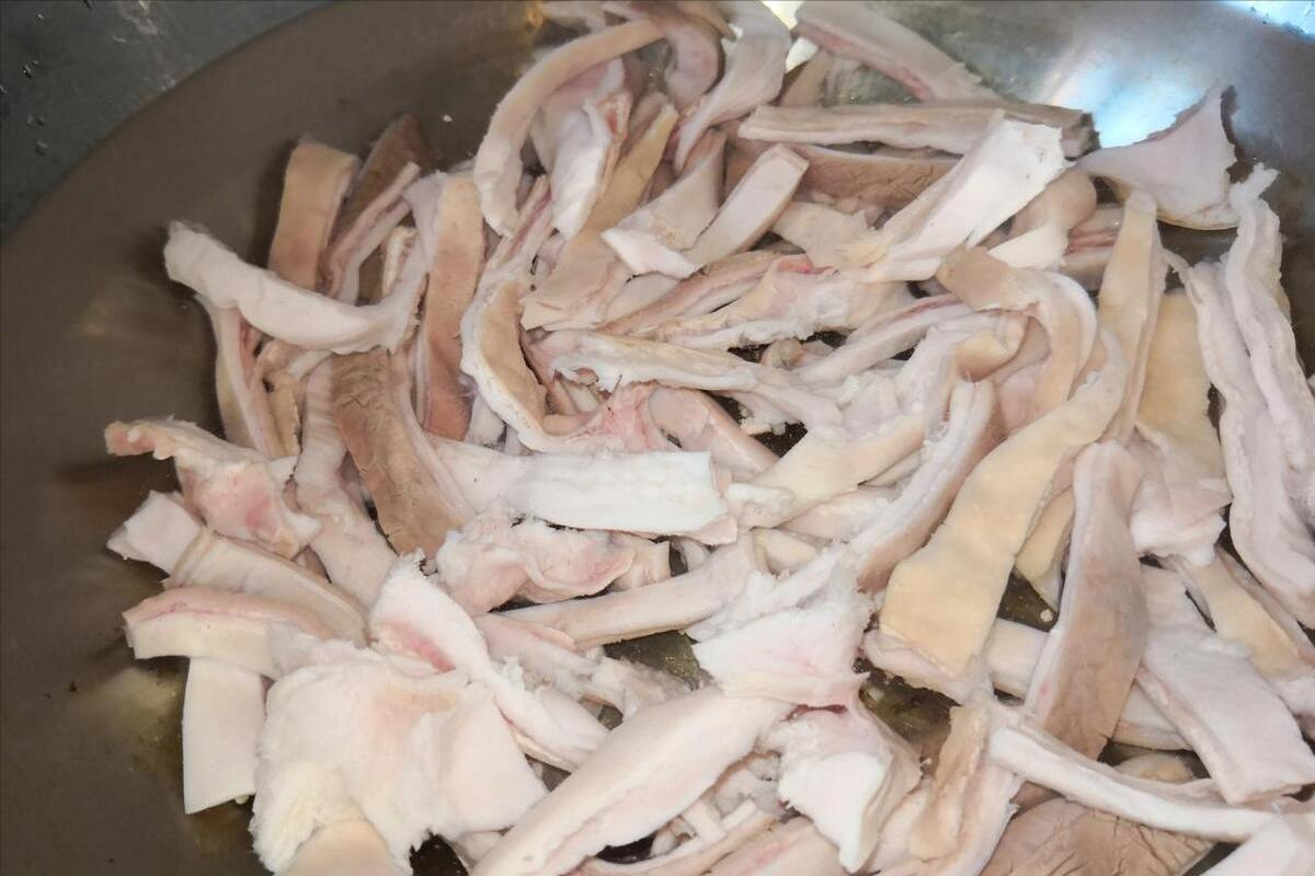 3、洗淨後的豬肚,將其切成條狀,然後下入鍋中,加上蔥姜、料酒來焯水,焯水之後撈出來,瀝乾水分。接下來準備好燉鍋,把豬肚直接倒進去就行,然後再往裏面添水,注入沒過豬肚的清水。