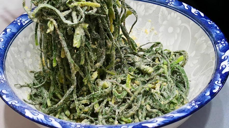 然後取適量的玉米麪和豆麪,比例約爲2:1,攪拌均勻後撒到山麪湯菜上,一邊撒一邊用筷子翻動攪拌,讓每根山麪湯菜都均勻地裹上面粉,這樣蒸好的山麪湯菜鬆散好喫不粘連。