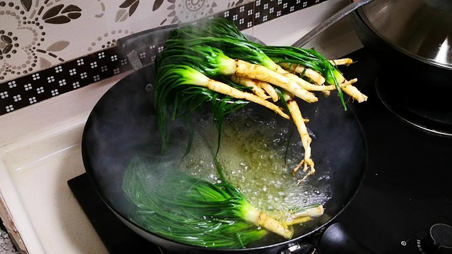 3.然後再來炸個蔥油:鍋中加油,放入蔥段小火慢慢煽炒,炒至蔥段顏色微微變黃時關火,利用鍋的餘溫繼續將蔥段炸香,然後撈出蔥段不要,這樣炸的蔥油特別香,用它拌山麪湯菜,蒸出來後會格外香。