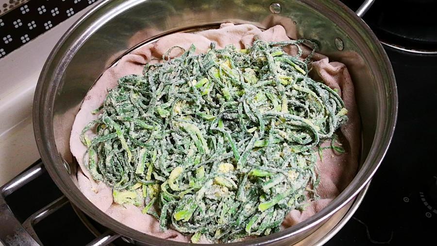 5.取一個蒸鍋,將蒸屜中鋪上一層打溼的籠布,大火燒開後,再把山麪湯菜放入,攤平後繼續蒸8分鐘左右。