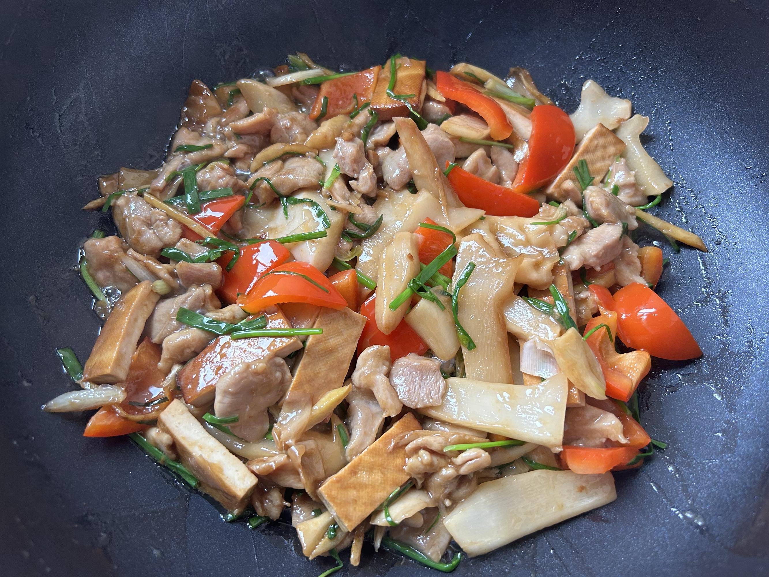 加入炒熟的雞胸肉翻炒均勻,出鍋前加入香蔥段翻炒到斷生,一道營養好喫的筍片炒香乾就做好了。