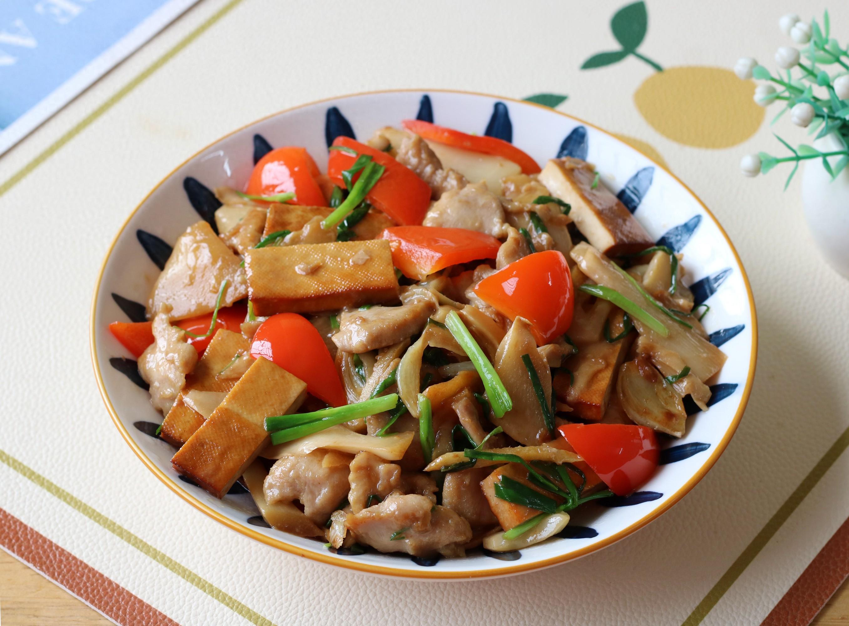 竹筍的喫法很多,搭配高蛋白低脂肪的雞胸肉和豆腐,營養好喫又不怕長肉。今天就給大家分享一下筍片炒香乾的做法,需要準備的食材有:筍片 適量,五香豆腐乾 1片,雞胸肉 適量,彩椒 1個,大蒜 6瓣,生薑 1塊,小蔥 適量,食用油 適量,鹽 適量,玉米澱粉 適量,生抽 適量。