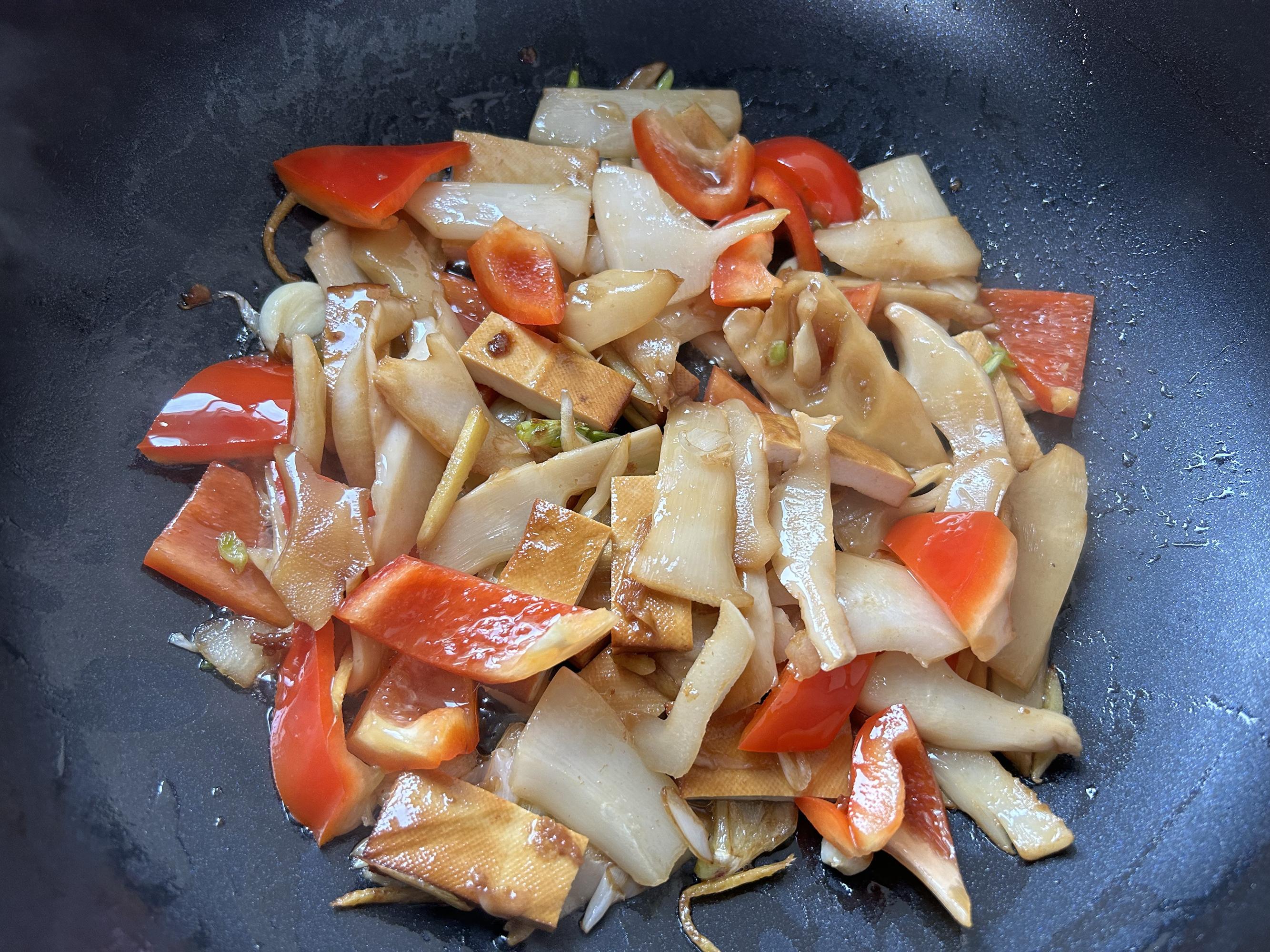 鍋裏重新放油,放入薑絲、蒜片翻炒出香味,加入筍片翻炒均勻,加一點生抽翻炒上色。