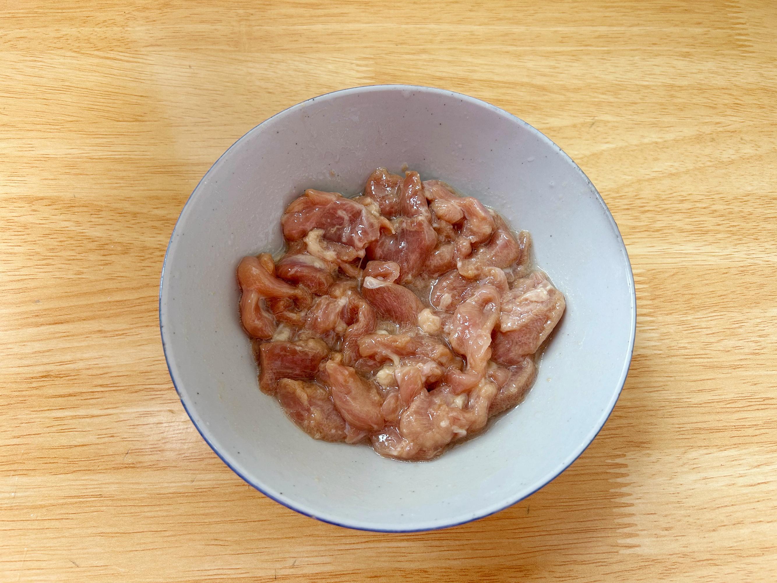 雞胸肉清洗乾淨,撕掉表面的薄膜,切成薄片,加入生抽、玉米澱粉翻拌均勻,加適量的食用油鎖住水分。