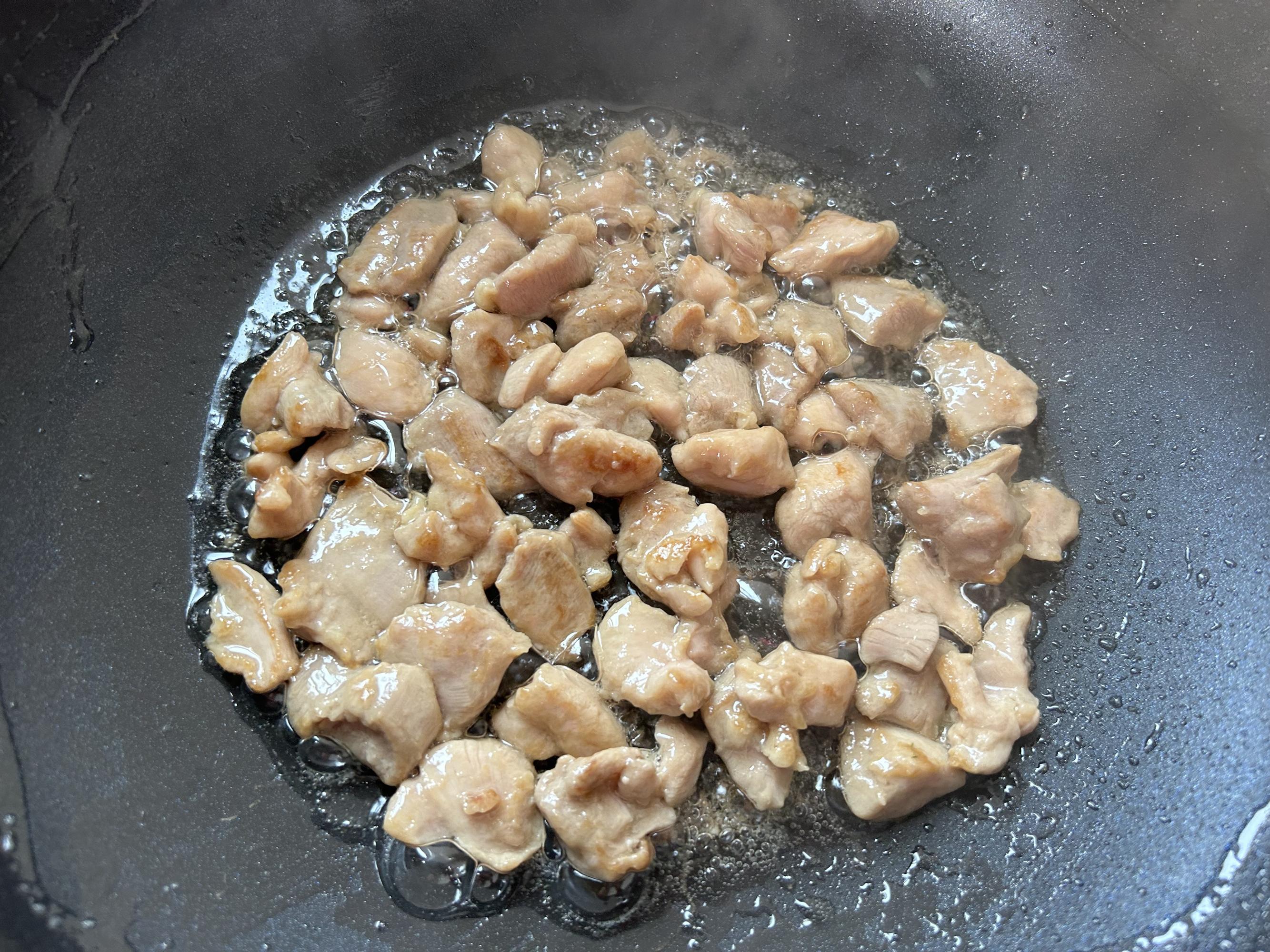 熱鍋放油,放入醃好的雞胸肉翻炒到熟透,盛出來放一邊。