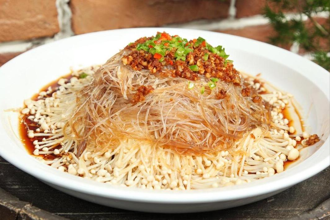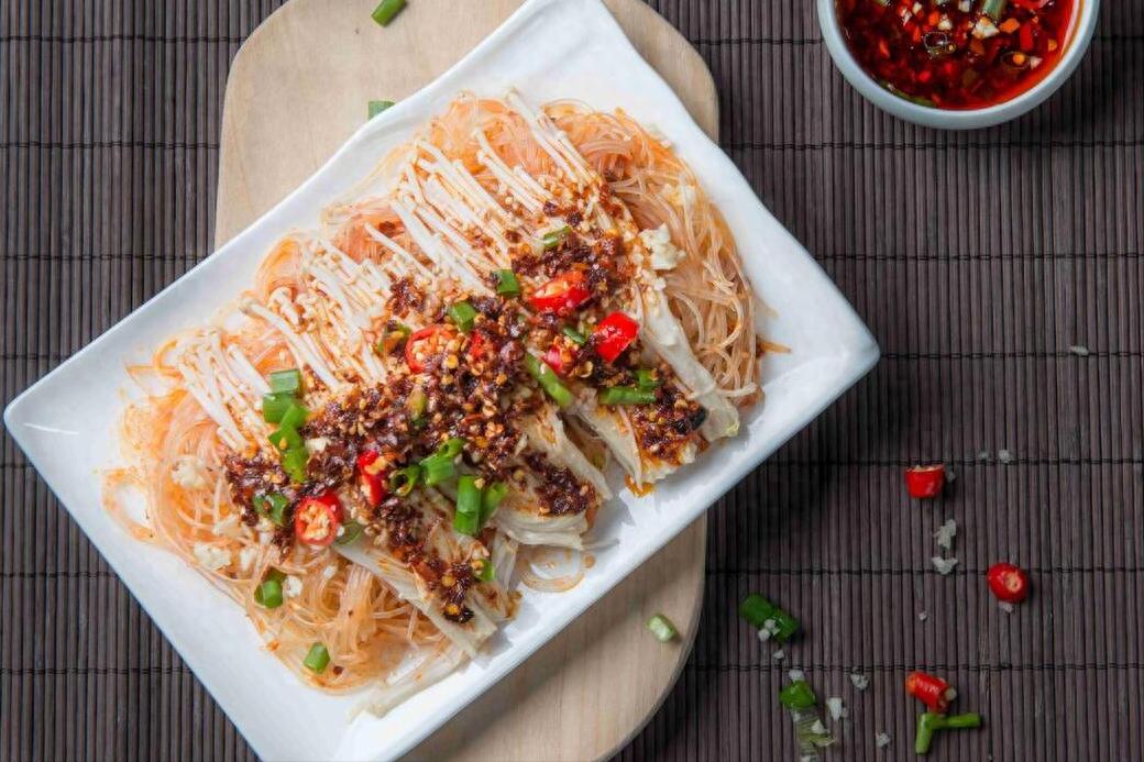 食材:金針菇、粉絲、大蒜、紅辣椒、蔥花、鹽、白糖、生抽、蠔油、食用油