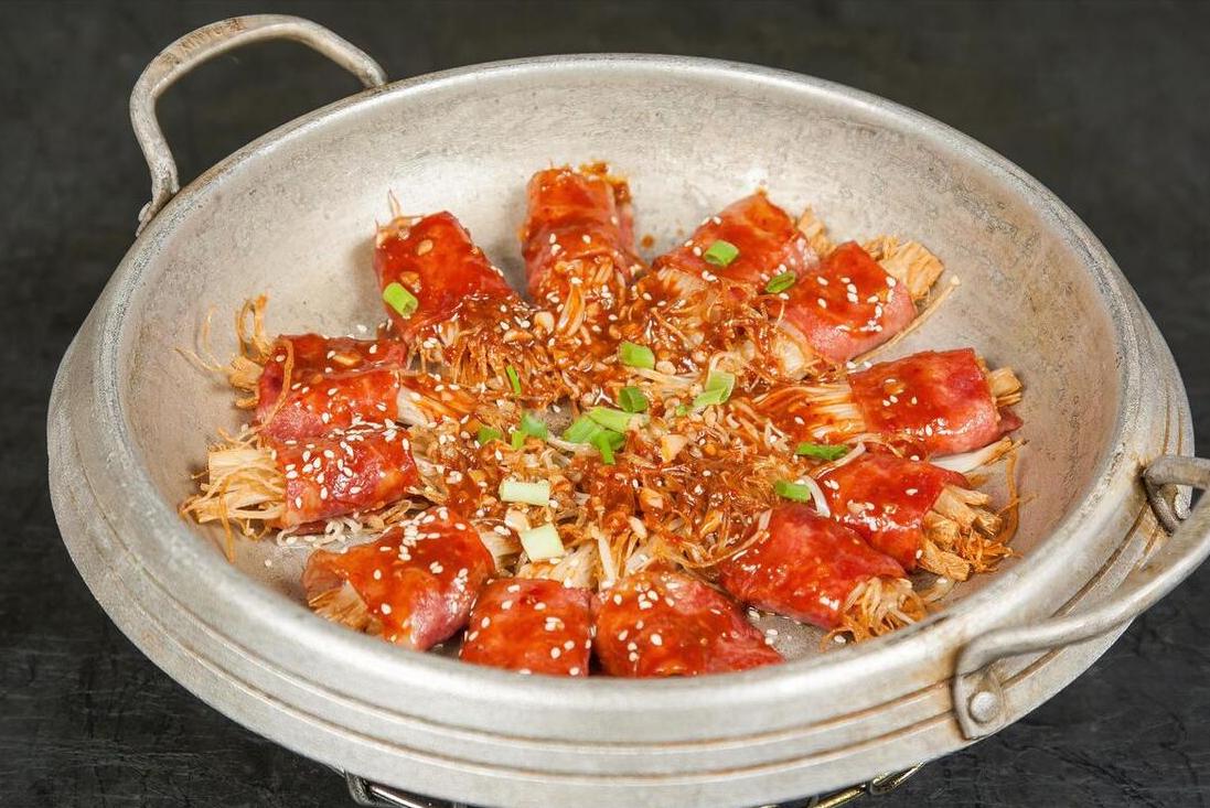 1、培根從冰箱裏拿出來解凍,金針菇把根部切掉,然後放在水中清洗乾淨,接下來用培根把金針菇捲起來,插一根牙籤固定。
