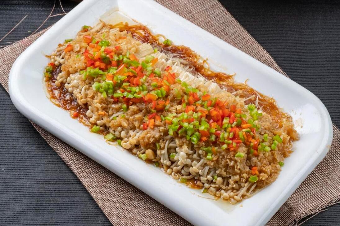 2、接下來把大蒜、紅辣椒、蔥花都切好,然後起油鍋,燒熱後下入蒜末,煸炒出香味,接着倒上紅辣椒,用適量的鹽、白糖、生抽、蠔油調味,炒勻後澆在金針菇上面,放到鍋中。大火燒開後,繼續蒸6分鐘左右,就可以出鍋了,撒上蔥花開喫。
