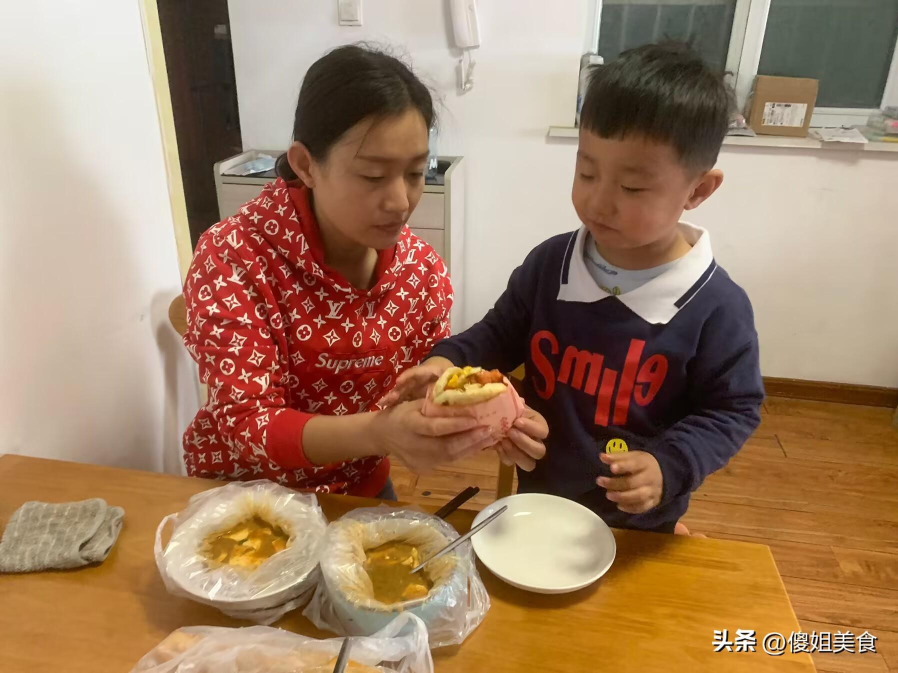 買回早點後,孩子們就已經起牀了,坐在餐桌上等着喫飯,老大有時候懂事的很喜人,幫我去拿碗和勺子,給老二拿出燒餅,讓孩子自己喫,孩子不停的喊:謝謝媽媽。