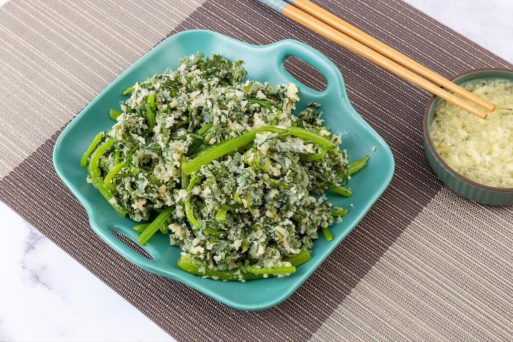 食材:新鮮茼蒿、玉米麪、麪粉、鹽、生抽、醋、香油、辣椒油、大蒜