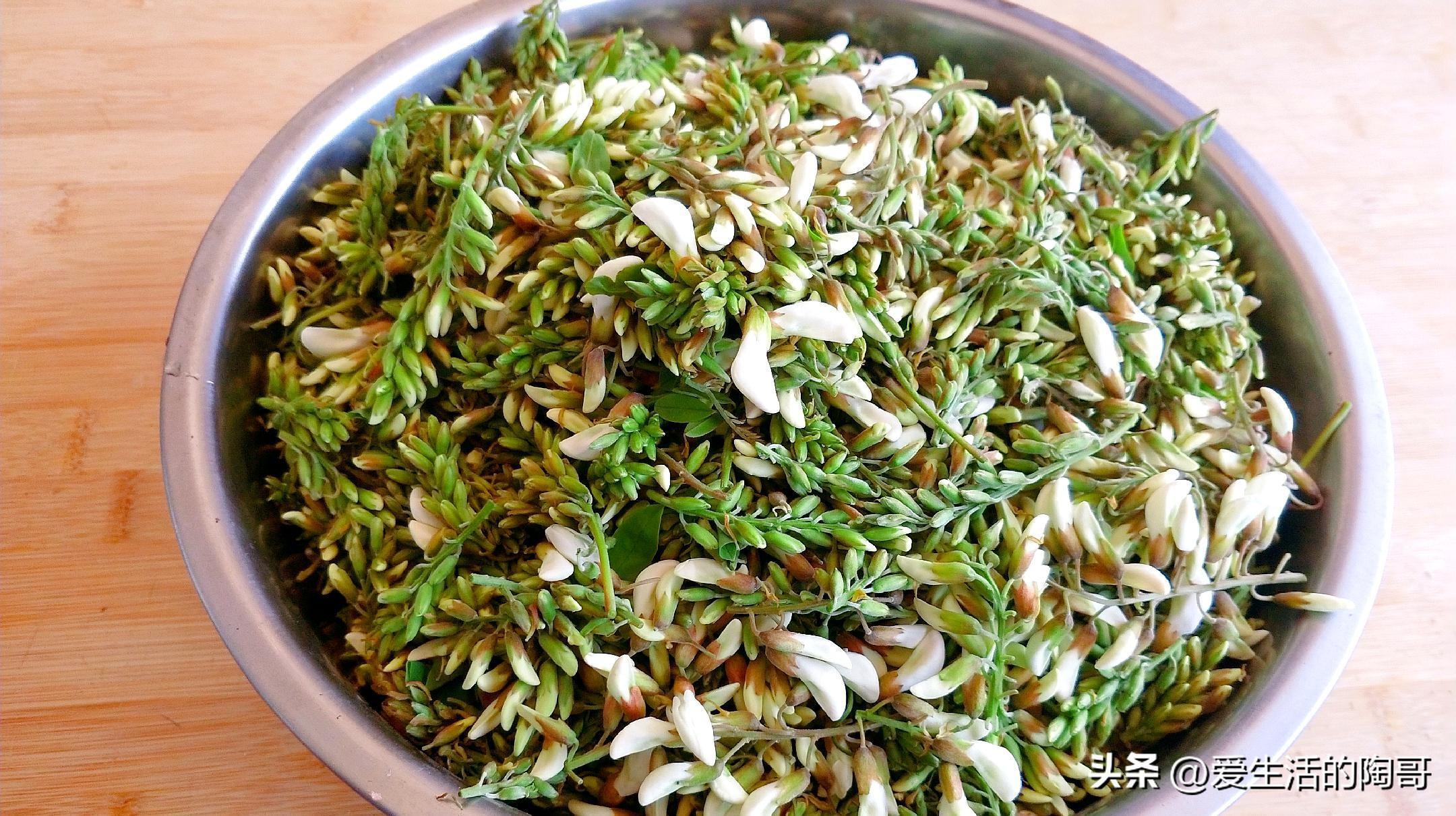 新鮮槐花搭配麪粉一起蒸着喫,既可以當菜餚,還可以當主食,好喫美味。