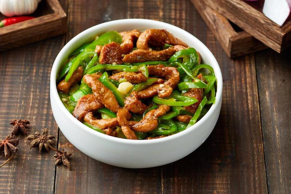 用到:青椒、裏脊肉、大蒜、甜麪醬、鹽、雞精、澱粉、料酒、食用油