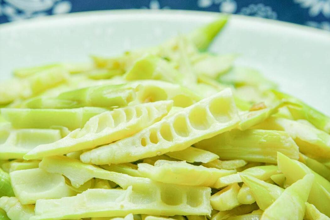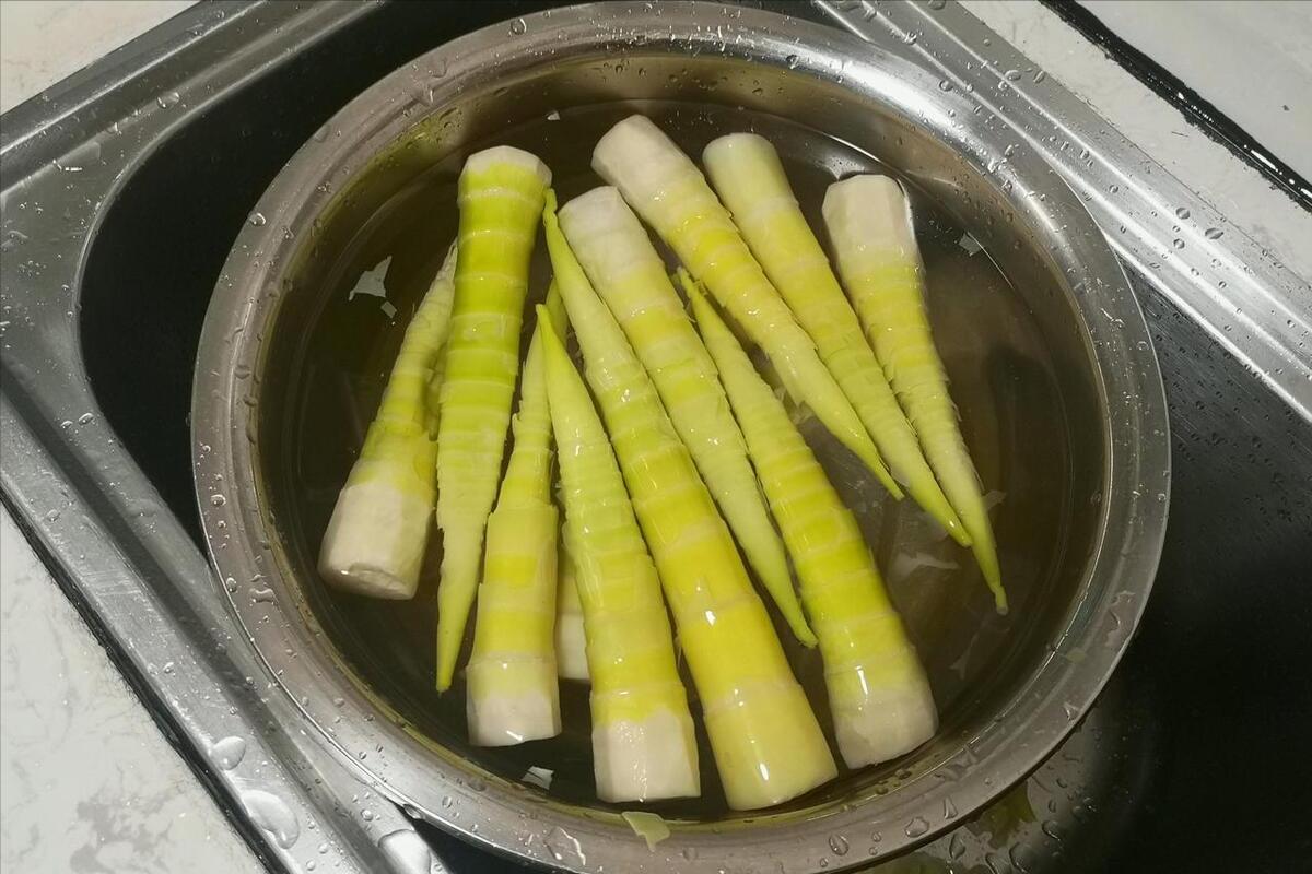 4、春筍焯水的時間,要比普通的蔬菜長一些,大概4、5分鐘過後就可以撈出來了,撈出來立馬倒在涼開水中,過一下涼開水以後,我們將其撈出來,把水分瀝乾,最好放到室外晾一會兒,直至徹底沒有水分爲止。