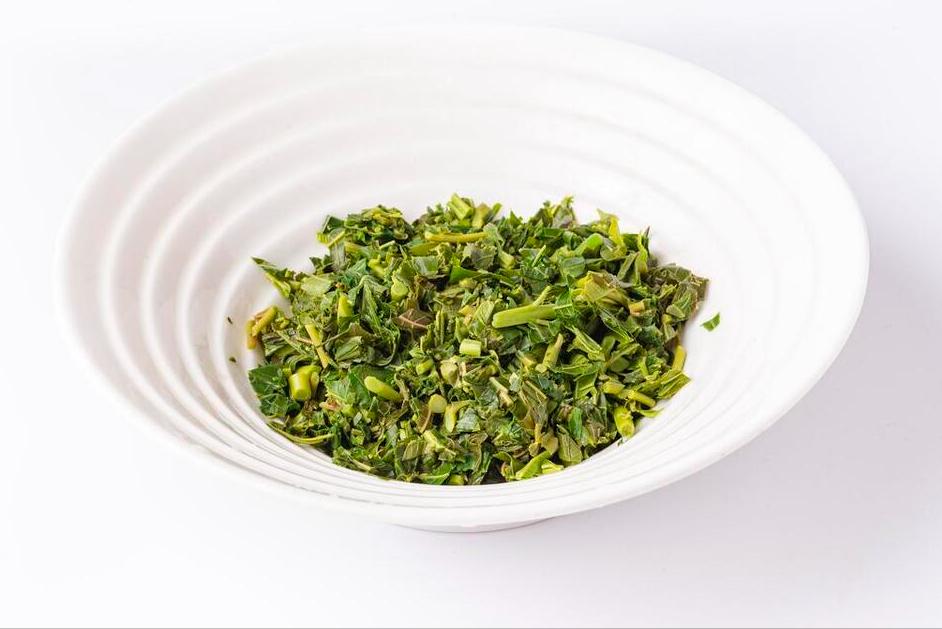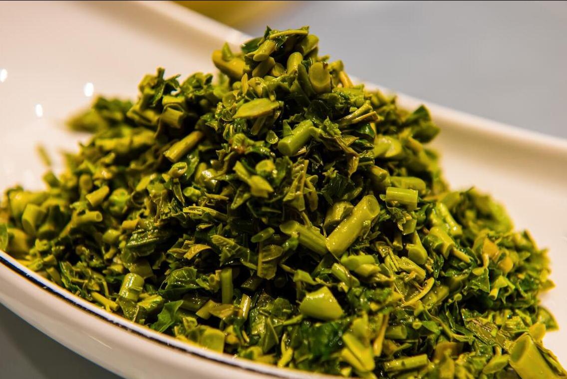 3、直至香椿徹底變綠後,就可以撈出來了,過一下涼水,然後將水分徹底擠幹,放到案板上切成末。如果家裏有搗蒜器的,放在裏面加上1勺鹽,充分捶打一下,這樣味道會更香,沒有的話就算了。