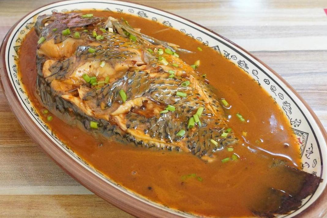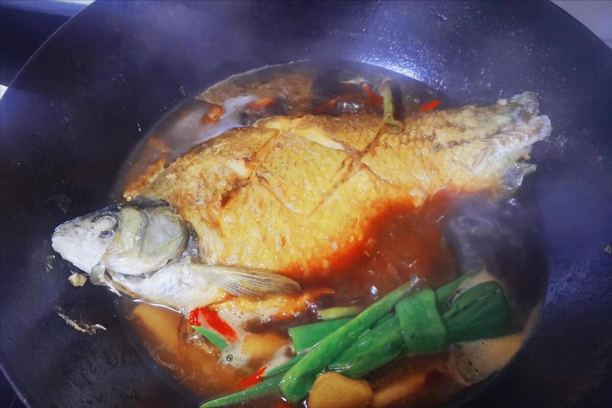 2、接下來來點香醋、生抽、老抽、料酒、鹽、雞精、胡椒粉調味,接着來上適量的清水,也不需要太多了,差不多和魚齊平即可,然後將蓋子蓋上燜一會兒,直至湯汁收幹後,嚐嚐鹹淡,合適的話就出鍋吧!