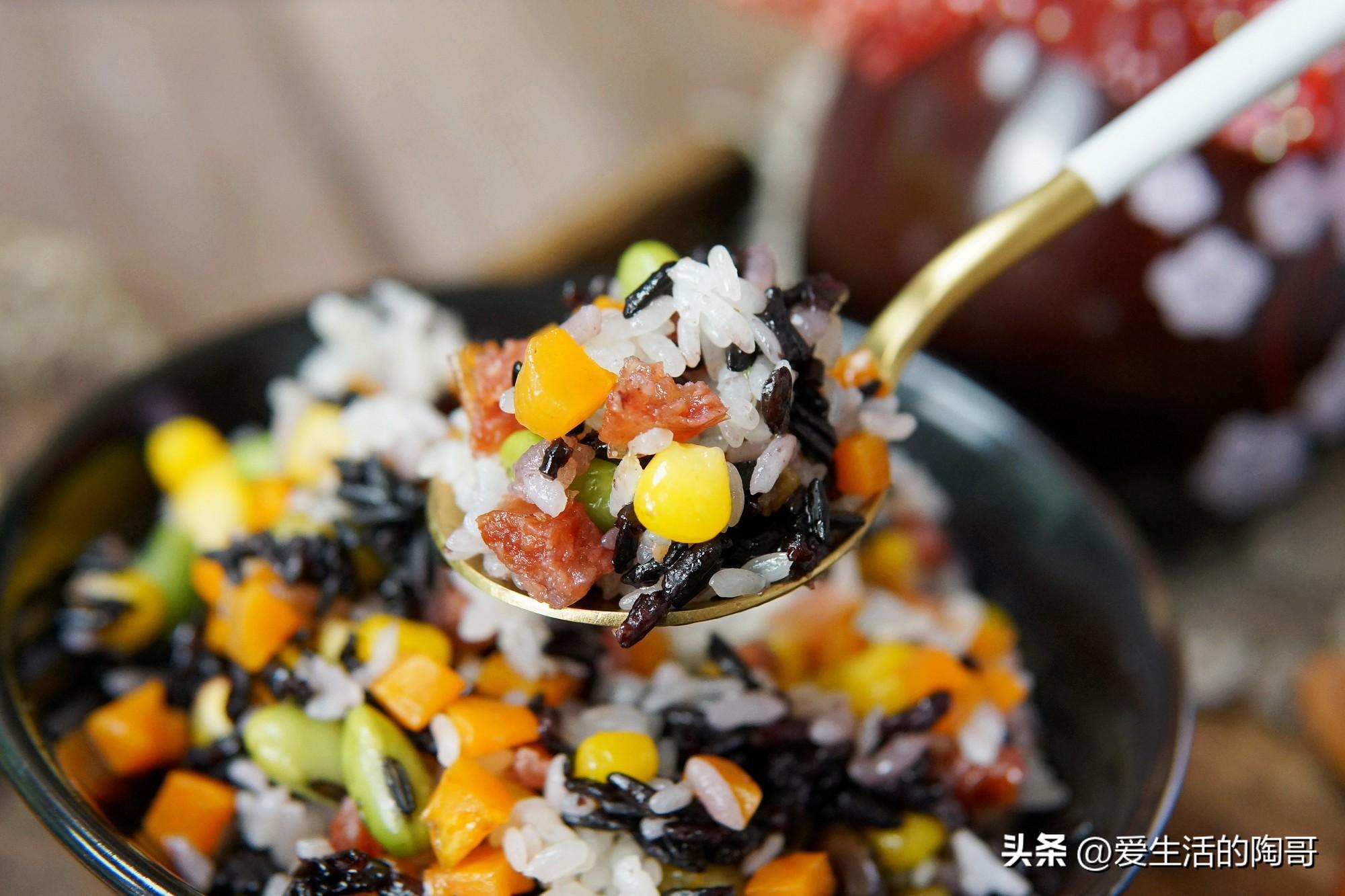 食材:糯米,大米,豌豆,臘腸,黑米,胡蘿蔔,玉米